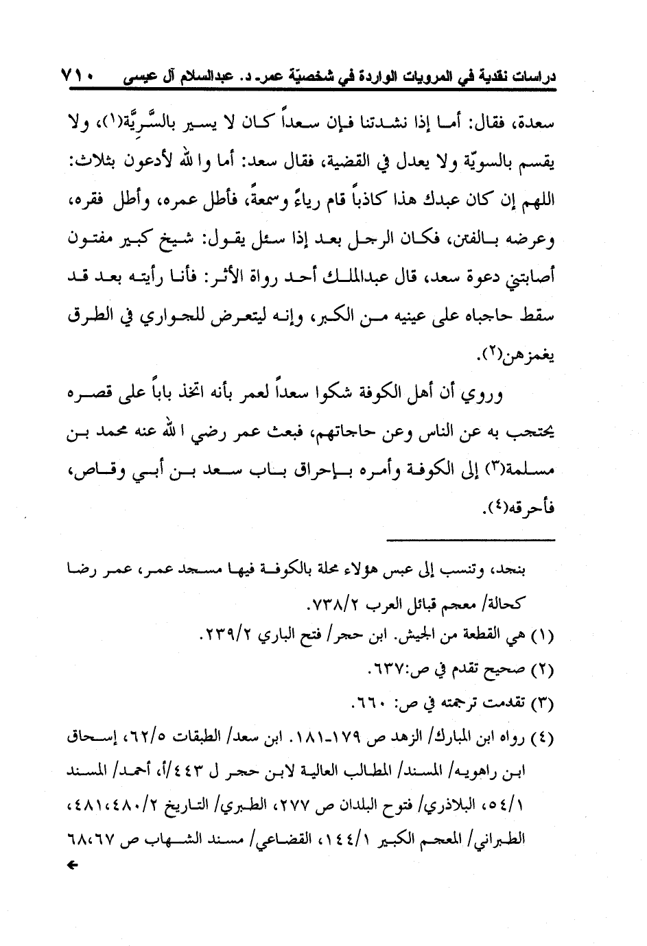 4 رواه ابن المبارك/ الزهد ص 179181. ابن سعد/ الطبقات 5/62، إسحاق ابن راهويه/ المسند/ المطالب العالية لابن حجر ل 443/أ، أحمد/ المسند 1/54، البلاذري/ فتوح البلدان ص 277، الطبري/ التاريخ 2/480،481، الطبراني/ المعجم الكبير 1/144، القضاعي/ مسند الشهاب ص 67،68 ورجال إسناده عند ابن المبارك ثقات ولكنه منقطع من رواية عباية بن رافع بن خديج عن عمر رضي الله عنه وهو ثقة من الثالثة، ورواه سائر من رواه من طريق عباية سوى ابن سعد فقد رواه من طريق الواقدي، والبلاذري من رواية الكلبي عن أبي مخنف، فالأثر ضعيف.