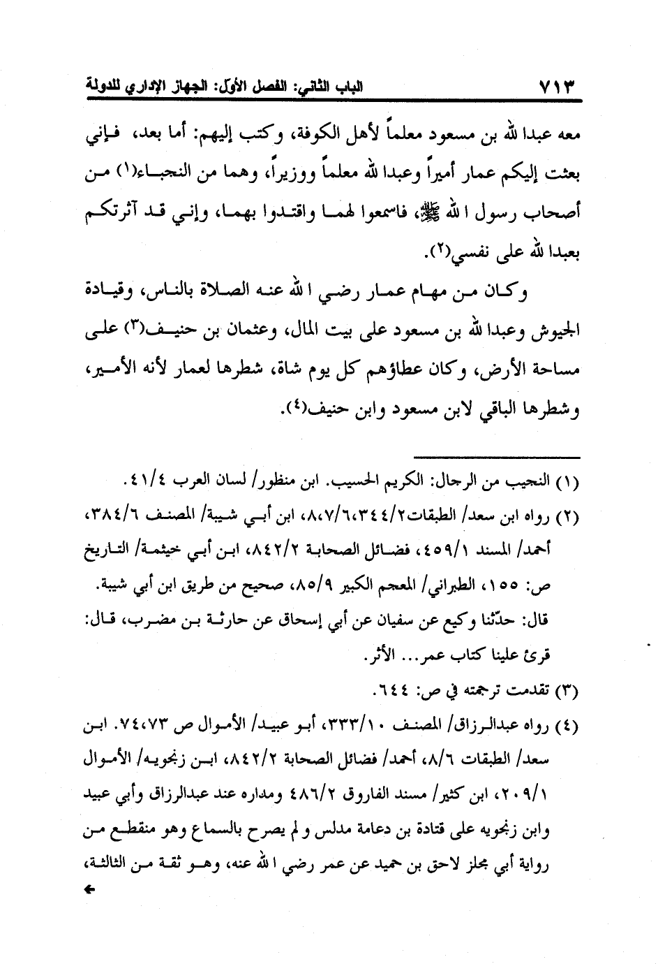 4 رواه عبد الرزاق/ المصنف 10/333، أبو عبيد/ الأموال ص 73،74. ابن سعد/ الطبقات 6/8، أحمد/ فضائل الصحابة 2/842، ابن زنجويه/ الأموال 1/209، ابن كثير/ مسند الفاروق 2/486 ومداره عند عبد الرزاق وأبي عبيد وابن زنجويه على قتادة بن دعامة مدلس ولم يصرح بالسماع وهو منقطع من رواية أبي مجلز لاحق بن حميد عن عمر رضي الله عنه، وهو ثقة من الثالثة، ورجاله عند عبد الرزاق ثقات، وسنده عند أحمد رجاله ثقات وفيه أبو إسحاق السبيعي وهو مدلس من الثالثة ولم يصرح بالسماع وليس فيه ذكر لجعل عمار على الصلاة والقتال ولكن هذه كانت من المهام التي يكلف بها الأمير كما مر ذلك في ذكر الأمراء السابقين. كما صرحت بذلك بقية مصادر الأثر.