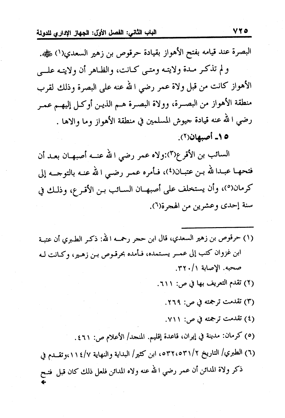 6 الطبري/ التاريخ 2/531،532، ابن كثير/ البداية والنهاية 7/114،وتقدم في ذكر ولاة المدائن أن عمر رضي الله عنه ولاه المدائن فلعل ذلك كان قبل فتح أصبهان حيث إن فتحها كان متأخراً بعدة سنوات عن فتح المدائن.