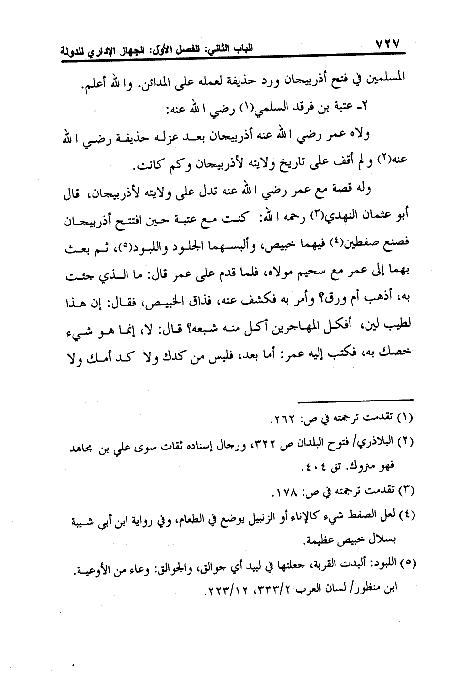 له قصة مع عمر رضي الله عنه تدل على ولايته لأذربيجان، قال أبو عثمان النهدي3 رحمه الله: كنت مع عتبة حين افتتح أذربيجان فصنع صفطين4 فيهما خبيص، وألبسهما الجلود واللبود5، ثم بعث بهما إلى عمر مع سحيم مولاه، فلما قدم على عمر قال: ما الذي جئت به، أذهب أم ورق؟ وأمر به فكشف عنه، فذاق الخبيص، فقال: إن هذا لطيب لين، أفكل المهاجرين أكل منه شبعه؟ قال: لا، إنما هو شيء خصك به، فكتب إليه عمر: أما بعد، فليس من كدك ولا كد أمك ولا