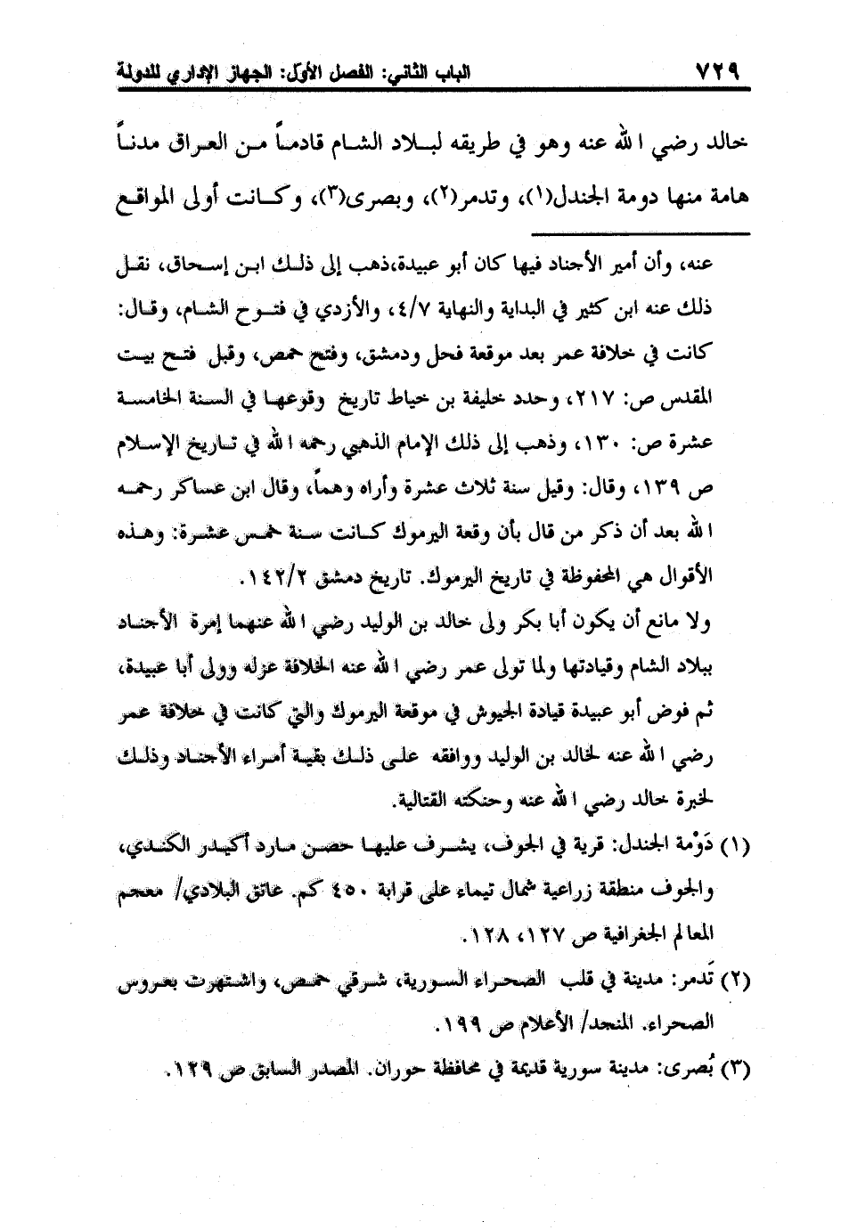 خالد رضي الله عنه وهو في طريقه لبلاد الشام قادماً من العراق مدناً هامة منها دومة الجندل1، وتدمر2، وبصرى3، وكانت أولى المواقع