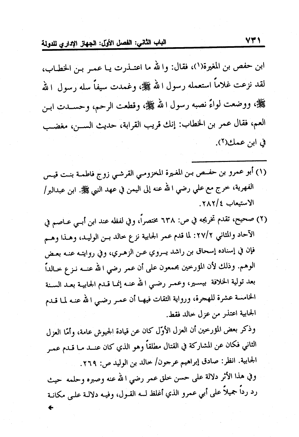 ابن حفص بن المغيرة1، فقال: والله ما اعتذرت يا عمر بن الخطاب، لقد نزعت غلاماً استعمله رسول الله صلى الله عليه وسلم، وغمدت سيفاً سله رسول الله صلى الله عليه وسلم، ووضعت لواءً نصبه رسول الله صلى الله عليه وسلم، وقطعت الرحم، وحسدت ابن العم، فقال عمر بن الخطاب: إنك قريب القرابة، حديث السن، مغضب في ابن عمك2.