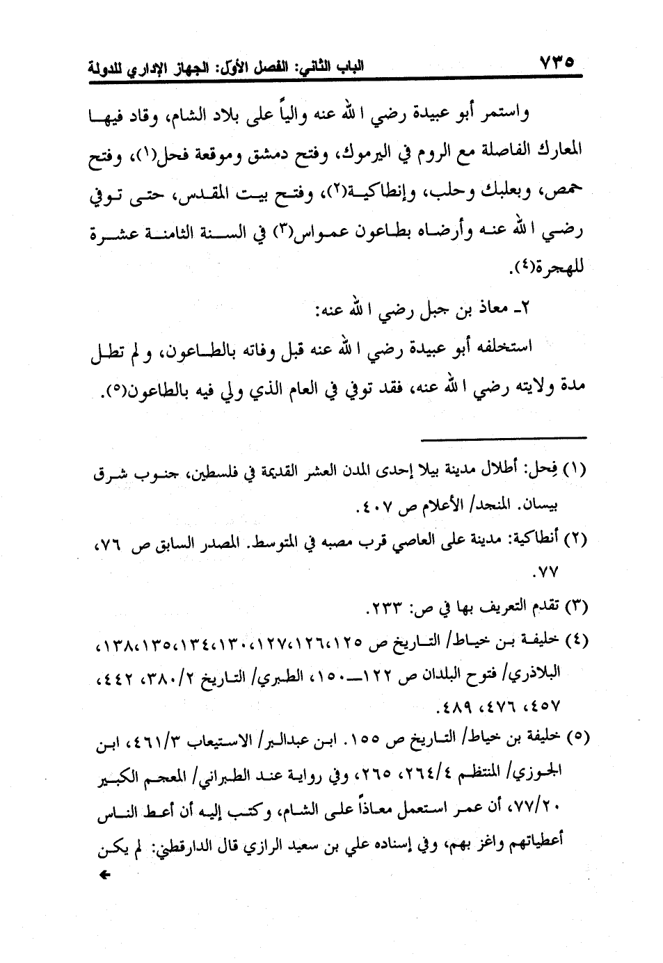 5 خليفة بن خياط/ التاريخ ص 155. ابن عبد البر/ الاستيعاب 3/461، ابن الجوزي/ المنتظم 4/264، 265، وفي رواية عند الطبراني/ المعجم الكبير 20/77، أن عمر استعمل معاذاً على الشام، وكتب إليه أن أعط الناس أعطياتهم واغز بهم، وفي إسناده علي بن سعيد الرازي قال الدارقطني: لم يكن بذاك في حديثه، وحدث بأحاديث لم يتابع عليها، وتكلم فيه أصحابنا بمصر. الذهبي/ سير أعلام النبلاء 14/145، فالأثر ضعيف، ومعناه صحيح واستخلاف عمر معاذاً أي إقراره عليه بعد أن استخلفه أبو عبيدة.