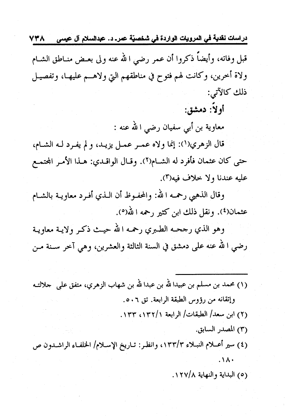 وقال الذهبي رحمه الله: والمحفوظ أن الذي أفرد معاوية بالشام عثمان4. ونقل ذلك ابن كثير رحمه الله5.