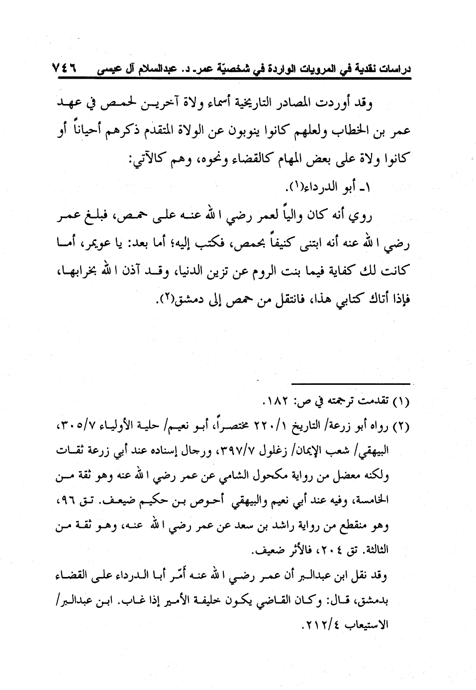 2 رواه أبو زرعة/ التاريخ 1/220 مختصراً، أبو نعيم/ حلية الأولياء 7/305، البيهقي/ شعب الإيمان/ زغلول 7/397، ورجال إسناده عند أبي زرعة ثقات ولكنه معضل من رواية مكحول الشامي عن عمر رضي الله عنه وهو ثقة من الخامسة، وفيه عند أبي نعيم والبيهقي أحوص بن حكيم ضيعف. تق 96، وهو منقطع من رواية راشد بن سعد عن عمر رضي الله عنه، وهو ثقة من الثالثة. تق 204، فالأثر ضعيف.
