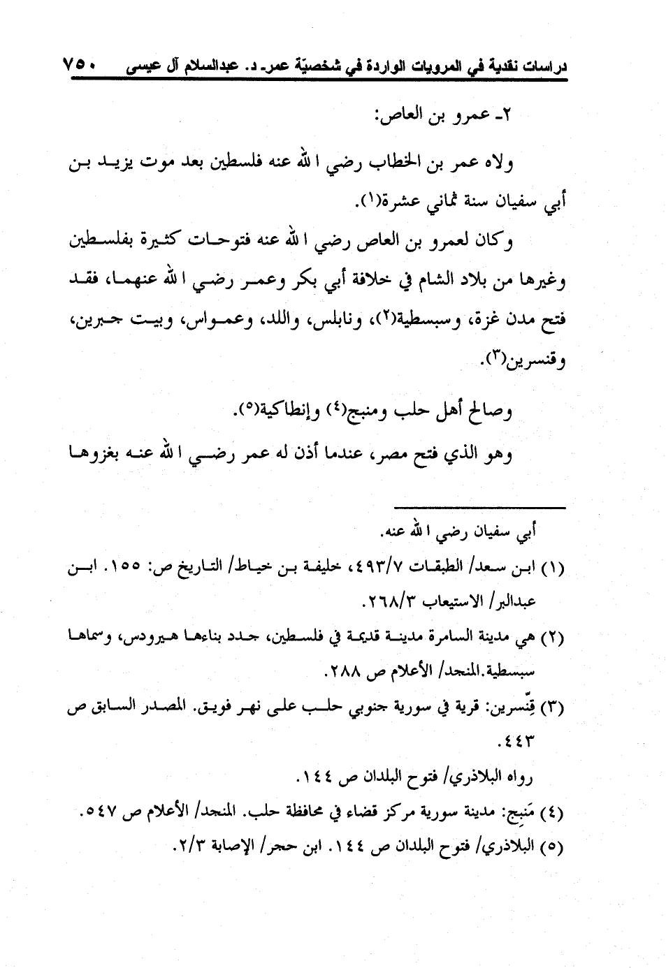 وكان لعمرو بن العاص رضي الله عنه فتوحات كثيرة بفلسطين وغيرها من بلاد الشام في خلافة أبي بكر وعمر رضي الله عنهما، فقد فتح مدن غزة، وسبسطية2، ونابلس، واللد، وعمواس، وبيت جبرين، وقنسرين3.