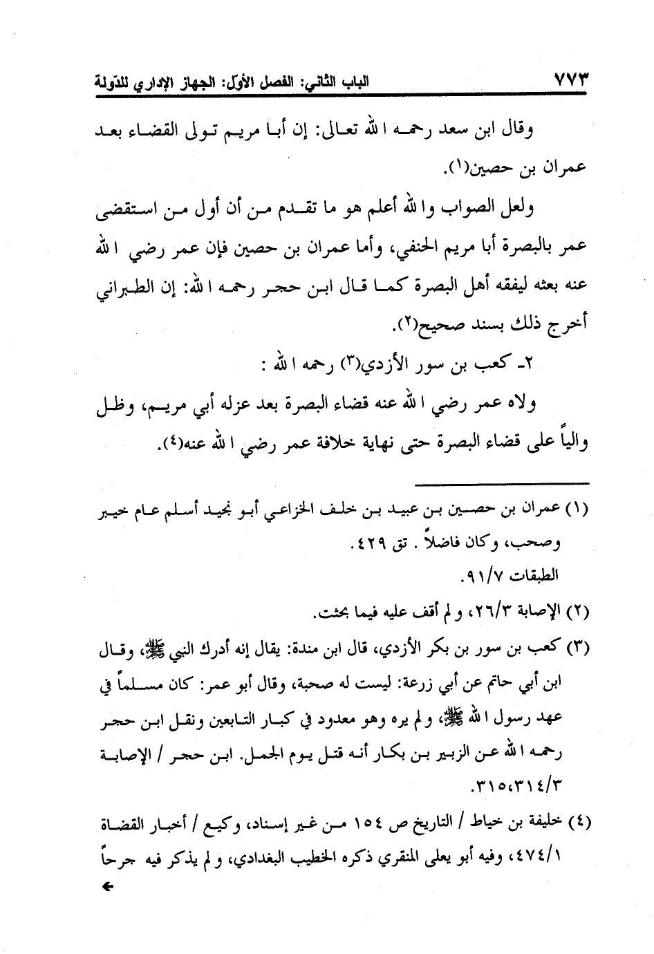 ولعل الصواب والله أعلم هو ما تقدم من أن أول من استقضى عمر بالبصرة أبا مريم الحنفي، وأما عمران بن حصين فإن عمر رضي الله عنه بعثه ليفقه أهل البصرة كما قال ابن حجر رحمه الله: إن الطبراني أخرج ذلك بسند صحيح2.