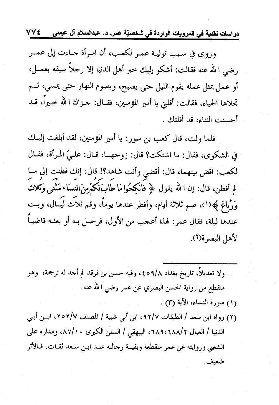 2 رواه ابن سعد / الطبقات 7/92، ابن أبي شيبة / المصنف 7/252، ابن أبي الدنيا / العيال 2/688،689، البيهقي / السنن الكبرى 10/87، ومداره على الشعبي وروايته عن عمر منقطعة وبقية رجاله عند ابن سعد ثقات. فالأثر ضعيف.