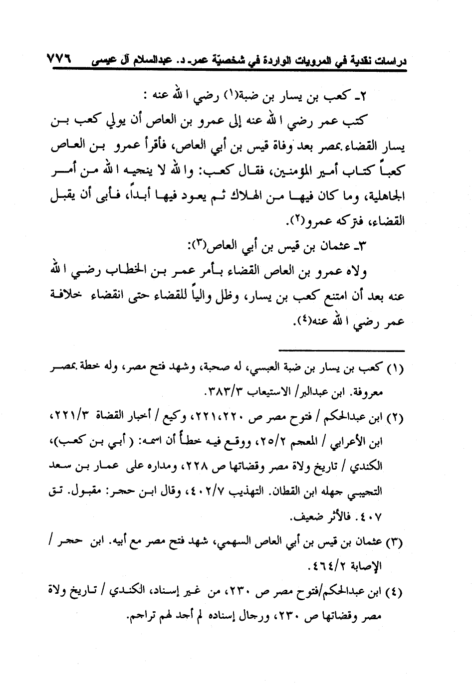 2 ابن عبد الحكم / فتوح مصر ص 220،221، وكيع / أخبار القضاة 3/221، ابن الأعرابي / المعجم 2/25، ووقع فيه خطأً أن اسمه: (أبي بن كعب) ، الكندي / تاريخ ولاة مصر وقضاتها ص 228، ومداره على عمار بن سعد التجيبي جهله ابن القطان. التهذيب 7/402، وقال ابن حجر: مقبول. تق 407. فالأثر ضعيف.