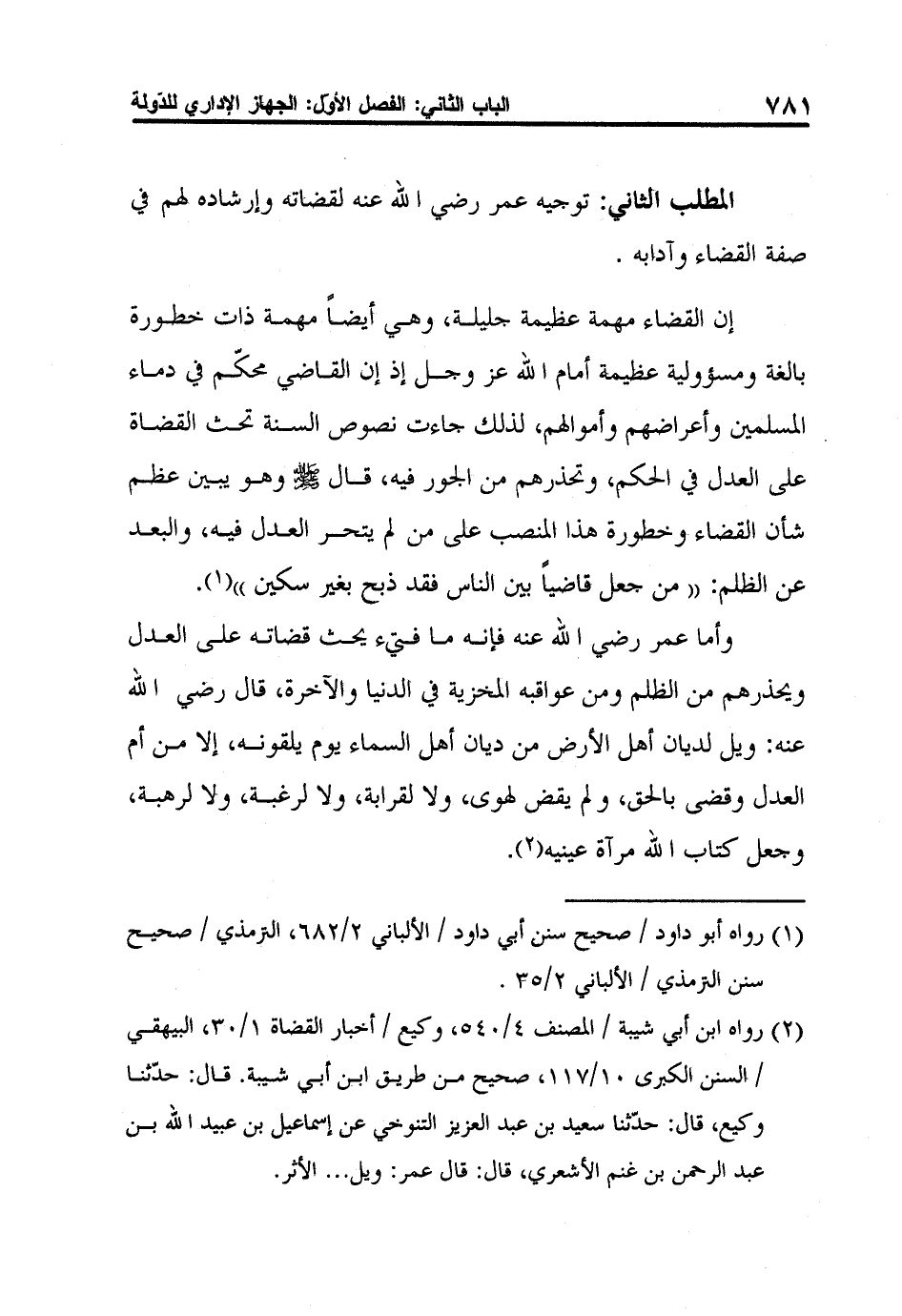2 رواه ابن أبي شيبة / المصنف 4/540، وكيع / أخبار القضاة 1/30، البيهقي / السنن الكبرى 10/117، صحيح من طريق ابن أبي شيبة. قال: حدّثنا وكيع، قال: حدّثنا سعيد بن عبد العزيز التنوخي عن إسماعيل بن عبيد الله بن عبد الرحمن بن غنم الأشعري، قال: قال عمر: ويل ... الأثر.