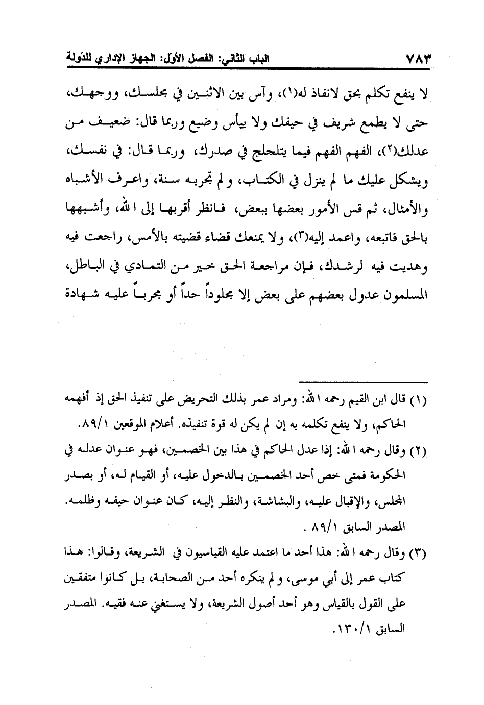 3 وقال رحمه الله: هذا أحد ما اعتمد عليه القياسيون في الشريعة، وقالوا: هذا كتاب عمر إلى أبي موسى، ولم ينكره أحد من الصحابة، بل كانوا متفقين على القول بالقياس وهو أحد أصول الشريعة، ولا يستغني عنه فقيه. المصدر السابق 1/130.