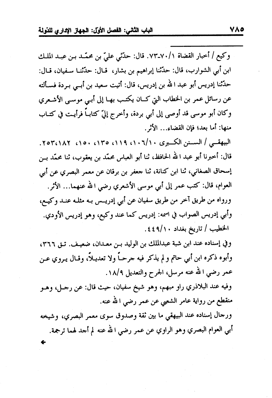 وكيع / أخبار القضاة 1/70-73. قال: حدّثي عليّ بن محمّد بن عبد الملك ابن أبي الشوارب، قال: حدّثنا إبراهيم بن بشار، قال: حدّثنا سفيان، قال: حدّثنا إدريس أبو عبد الله بن إدريس، قال: أتيت سعيد بن أبي بردة فسألته عن رسائل عمر بن الخطاب التي كان يكتب بها إلى أبي موسى الأشعري وكان أبو موسى قد أوصى إلى أبي بردة، وأخرج إليّ كتاباً فرأيت في كتاب منها: أما بعد، فإن القضاء ... الأثر.
