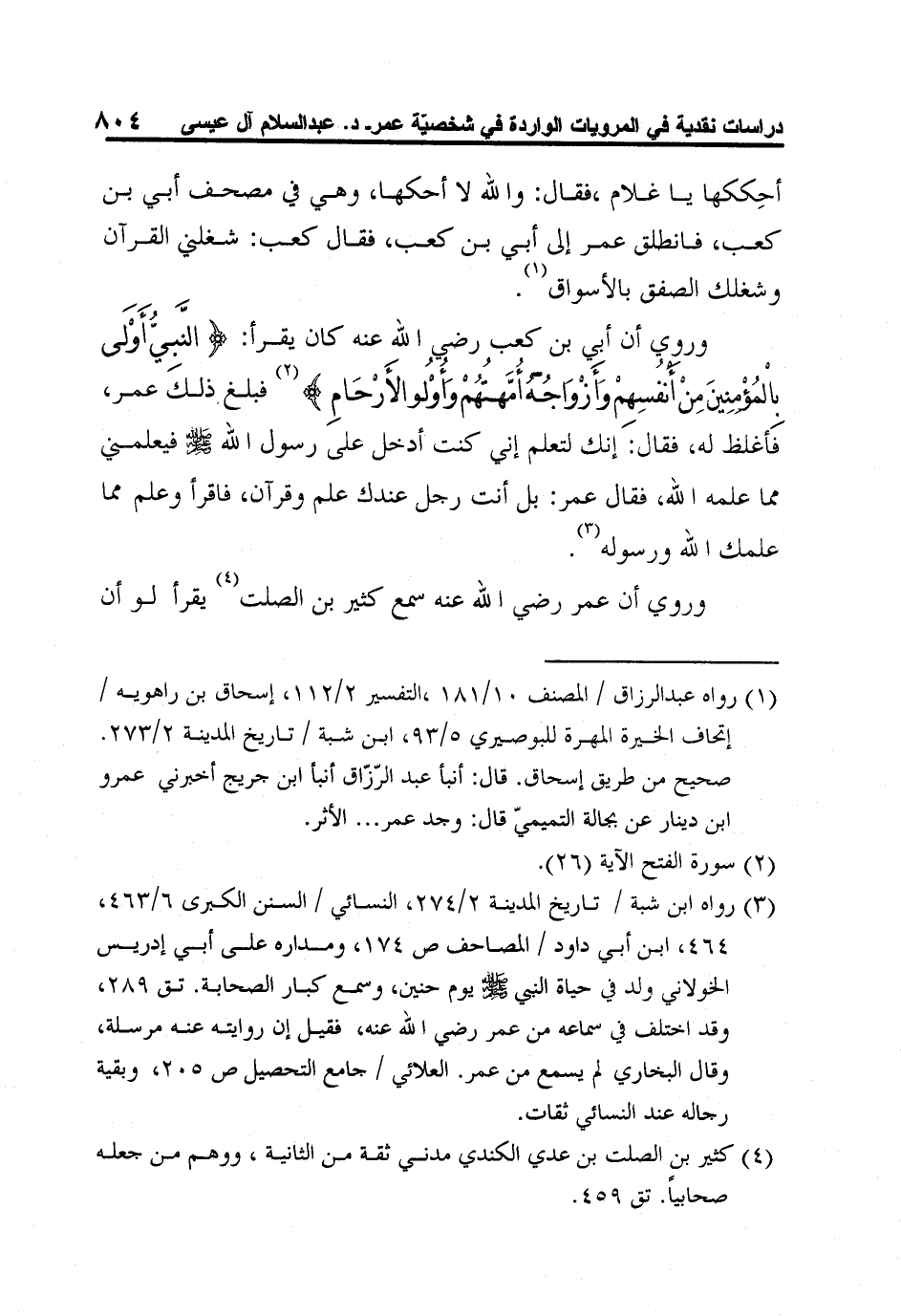 3 رواه ابن شبة / تاريخ المدينة 2/274، النسائي / السنن الكبرى 6/463، 464، ابن أبي داود / المصاحف ص 174، ومداره على أبي إدريس الخولاني ولد في حياة النبي صلى الله عليه وسلم يوم حنين، وسمع كبار الصحابة. تق 289، وقد اختلف في سماعه من عمر رضي الله عنه، فقيل إن روايته عنه مرسلة، وقال البخاري لم يسمع من عمر. العلائي / جامع التحصيل ص 205، وبقية رجاله عند النسائي ثقات.