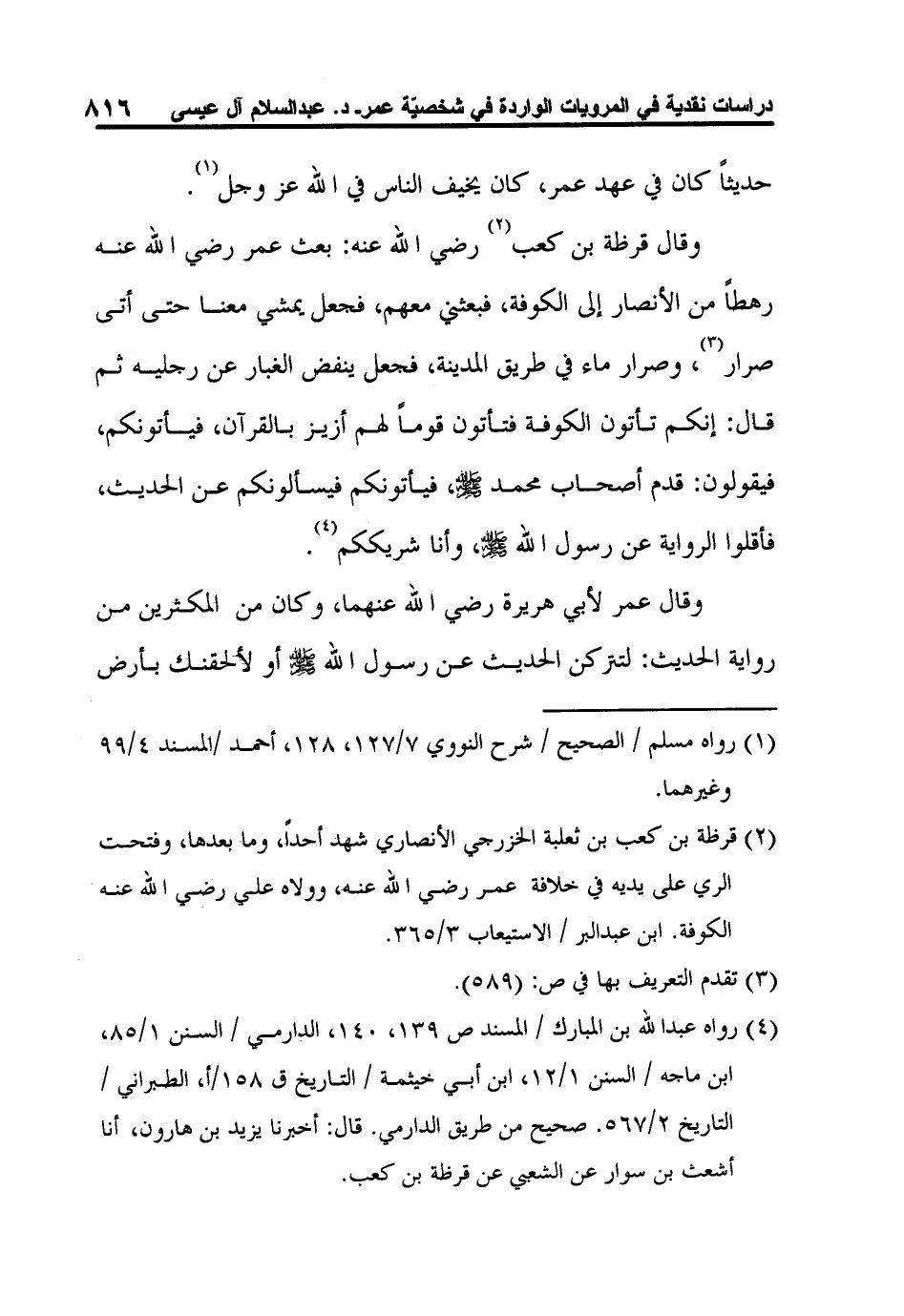 4 رواه عبد الله بن المبارك / المسند ص 139، 140، الدارمي / السنن 1/85، ابن ماجه / السنن 1/12، ابن أبي خيثمة / التاريخ ق 158/أ، الطبراني / التاريخ 2/567. صحيح من طريق الدارمي. قال: أخبرنا يزيد بن هارون، أنا أشعث بن سوار عن الشعبي عن قرظة بن كعب.