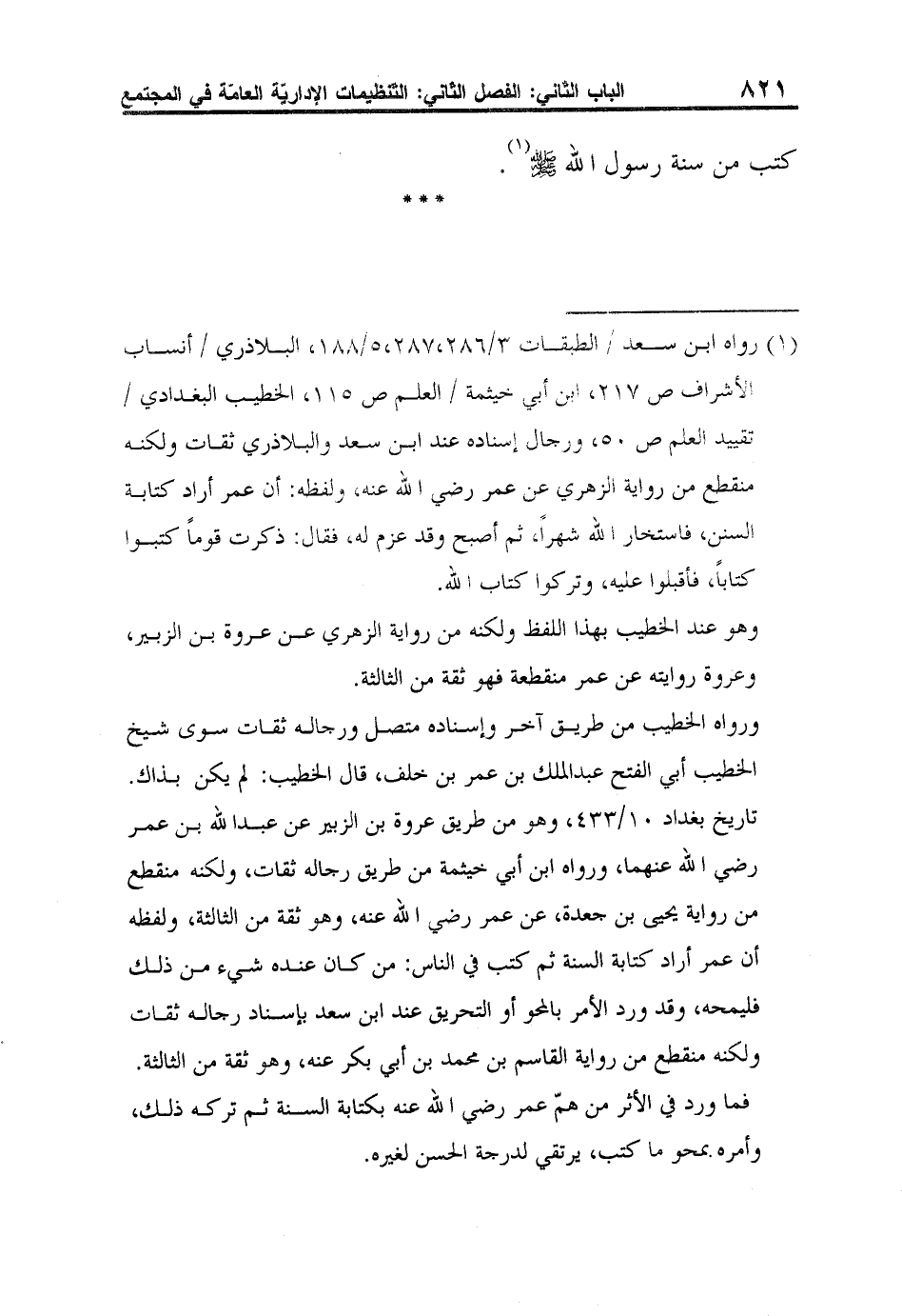 1 رواه ابن سعد / الطبقات 3/286،287،5/188، البلاذري / أنساب الأشراف ص 217، ابن أبي خيثمة / العلم ص 115، الخطيب البغدادي / تقييد العلم ص 50، ورجال إسناده عند ابن سعد والبلاذري ثقات ولكنه منقطع من رواية الزهري عن عمر رضي الله عنه، ولفظه: أن عمر أراد كتابة السنن، فاستخار الله شهراً، ثم أصبح وقد عزم له، فقال: ذكرت قوماً كتبوا كتاباً، فأقبلوا عليه، وتركوا كتاب الله.