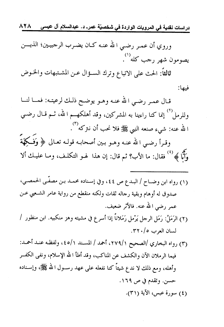 3 رواه البخاري /الصحيح 1/279، أحمد / المسند 1/45، ولفظه عند أحمد: فيما الرملان الآن والكشف عن المناكب، وقد أطأ الله الإسلام، ونفى الكفر وأهله، ومع ذلك لا ندع شيئاً كنا نفعله على عهد رسول الله صلى الله عليه وسلم، وإسناده حسن. وتقدم في ص 169.