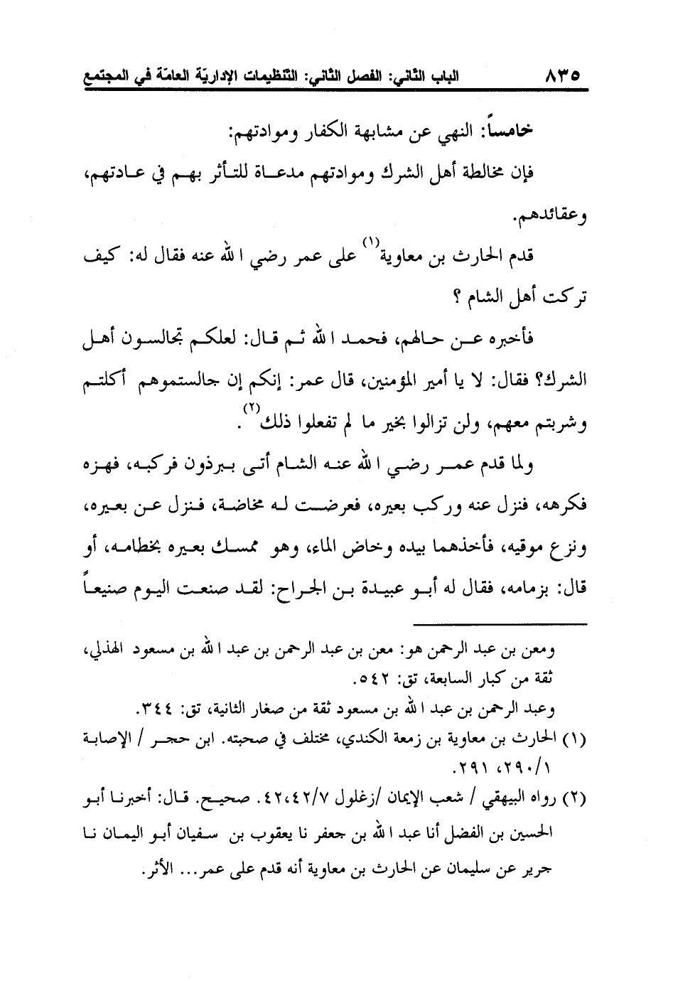 2 رواه البيهقي / شعب الإيمان /زغلول 7/42،42. صحيح. قال: أخبرنا أبو الحسين بن الفضل أنا عبد الله بن جعفر نا يعقوب بن سفيان أبو اليمان نا جرير عن سليمان عن الحارث بن معاوية أنه قدم على عمر ... الأثر.