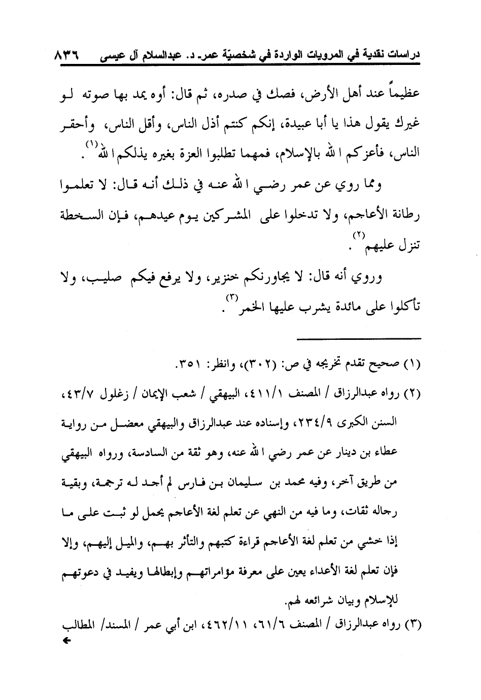 3 رواه عبد الرزاق / المصنف 6/61، 11/462، ابن أبي عمر / المسند/ المطالب العالية لابن حجر ص 490/أ، الحسن بن عرفة / جزء ص 90، البيهقي / السنن الكبرى 9/201، وفي إسناده عند عبد الرزاق زيد بن رفيع ضعفه الدارقطني، وقال النسائي: ليس بالقوي. ميزان الاعتدال 2/103، وفيه حرام ابن معاوية ذكره ابن أبي حاتم ولم يذكر فيه جرحاً ولا تعديلاً 3/282، وذكره ابن حبان في الثقات 4/185، وترجم له ابن حجر باسم حرام بن حكيم وقال: ثقة، من الثالثة. تق 155، روايته عن عمر مرسلة، ورواه سائر من رواه من طريق زيد بن رفيع به مثله، ورواه ابن أبي عمر من طريق آخر، وفيه ابن لهيعة صدوق خلط بعد احتراق كتبه، وفيه أبو النميري، وشيخه الباهلي الراوي عن عمر رضي الله عنه لم أجد لهما ترجمة. فالأثر ضعيف.