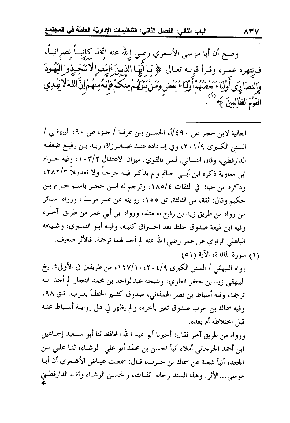 وصح أن أبا موسى الأشعري رضي الله عنه اتخذ كاتباً نصرانياً، فانتهره عمر، وقرأ قوله تعالى: {يَا أَيُّهَا الَّذِينَءَامَنُوا لاَ تَتَّخِذُوا الْيَهُودَ وَالنَّصَارَى أَوْلِيَاءَ بَعْضُهُمْ أَوْلِيَاءُ بَعْضٍ وَمَنْ يَتَوَلَّهُمْ مِنْكُمْ فَإِنَّهُ مِنْهُمْ إِنَّ اللَّهَ لاَ يَهْدِي الْقَوْمَ الظَّالِمِينَ} 1.
