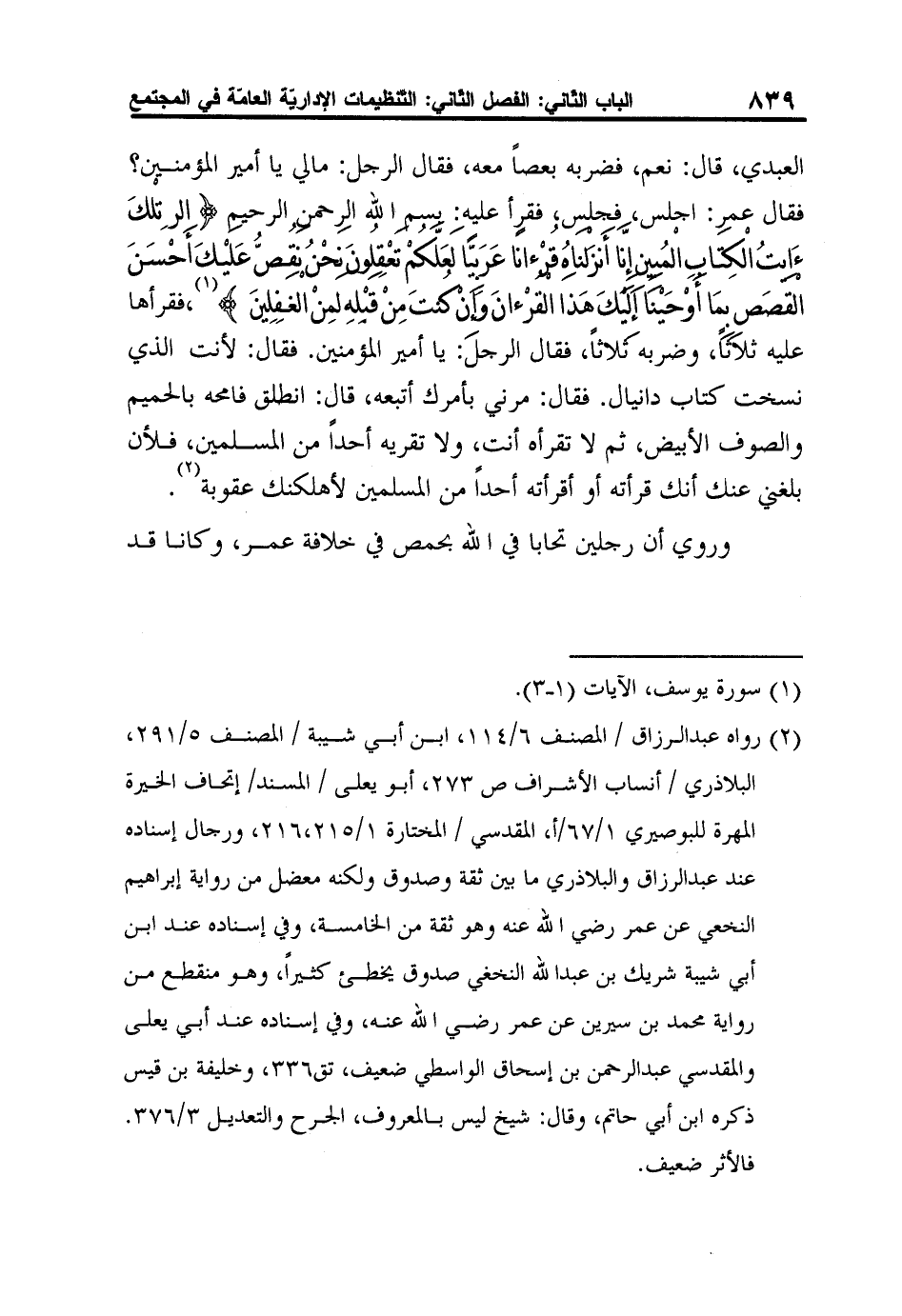 2 رواه عبد الرزاق / المصنف 6/114، ابن أبي شيبة / المصنف 5/291، البلاذري / أنساب الأشراف ص 273، أبو يعلى / المسند/ إتحاف الخيرة المهرة للبوصيري 1/67/أ، المقدسي / المختارة 1/215،216، ورجال إسناده عند عبد الرزاق والبلاذري ما بين ثقة وصدوق ولكنه معضل من رواية إبراهيم النخعي عن عمر رضي الله عنه وهو ثقة من الخامسة، وفي إسناده عند ابن أبي شيبة شريك بن عبد الله النخغي صدوق يخطئ كثيراً، وهو منقطع من رواية محمد بن سيرين عن عمر رضي الله عنه، وفي إسناده عند أبي يعلى والمقدسي عبد الرحمن بن إسحاق الواسطي ضعيف، تق 336، وخليفة بن قيس ذكره ابن أبي حاتم، وقال: شيخ ليس بالمعروف، الجرح والتعديل 3/376. فالأثر ضعيف.