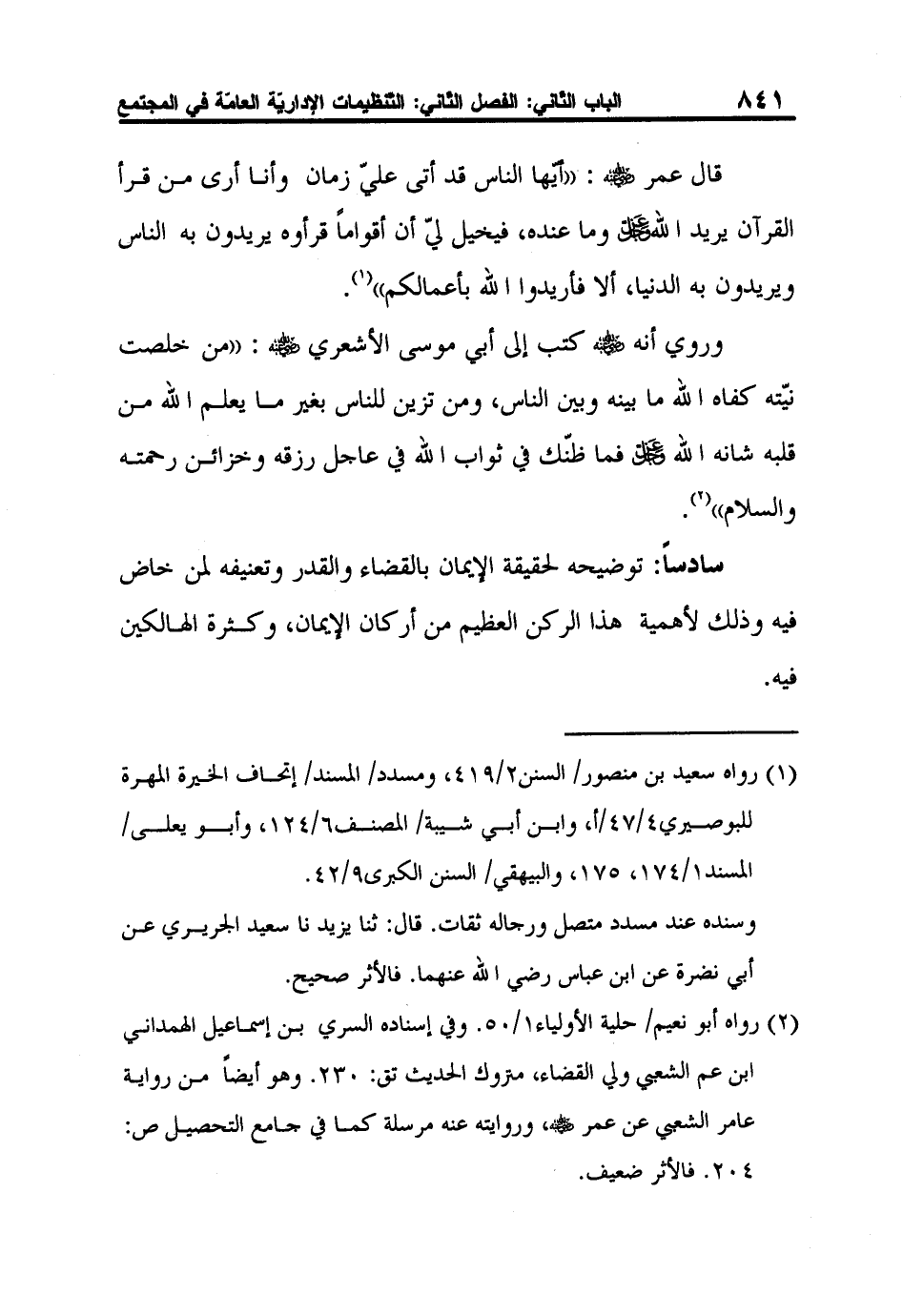 2 رواه أبو نعيم/ حلية الأولياء1/50. وفي إسناده السري بن إسماعيل الهمداني ابن عم الشعبي ولي القضاء، متروك الحديث تق: 230. وهو أيضاً من رواية عامر الشعبي عن عمر رضي الله عنه، وروايته عنه مرسلة كما في جامع التحصيل ص: 204. فالأثر ضعيف.