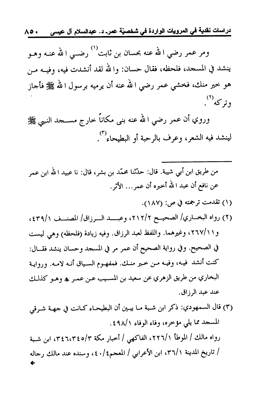 2 رواه البخاري/ الصحيح 2/212، وعبد الرزاق/ المصنف 1/439، و11/267، وغيرهما. واللفظ لعبد الرزاق. وفيه زيادة (فلحظه) وهي ليست في الصحيح. وفي رواية الصحيح أن عمر مر في المسجد وحسان ينشد فقال: كنت أنشد فيه، وفيه من خير منك. فمفهوم السياق أنه لامه. ورواية البخاري من طريق الزهري عن سعيد بن المسيب عن عمر رضي الله عنه وهو كذلك عند عبد الرزاق.