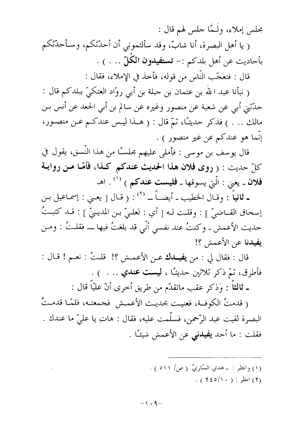 ثانياً: وقال الخطيب أيضاً (¬2) : "قال [يعني: إسماعيل بن إسحاق القاضيّ] : وقلت له [أي: لعليّ بن المدينيّ] : قد كتبتُ حديث الأعمش وكنتُ عند نفسي أنّي قد بلغتُ فيها فقلتُ: ومن يفيدنا عن الأعمش؟!