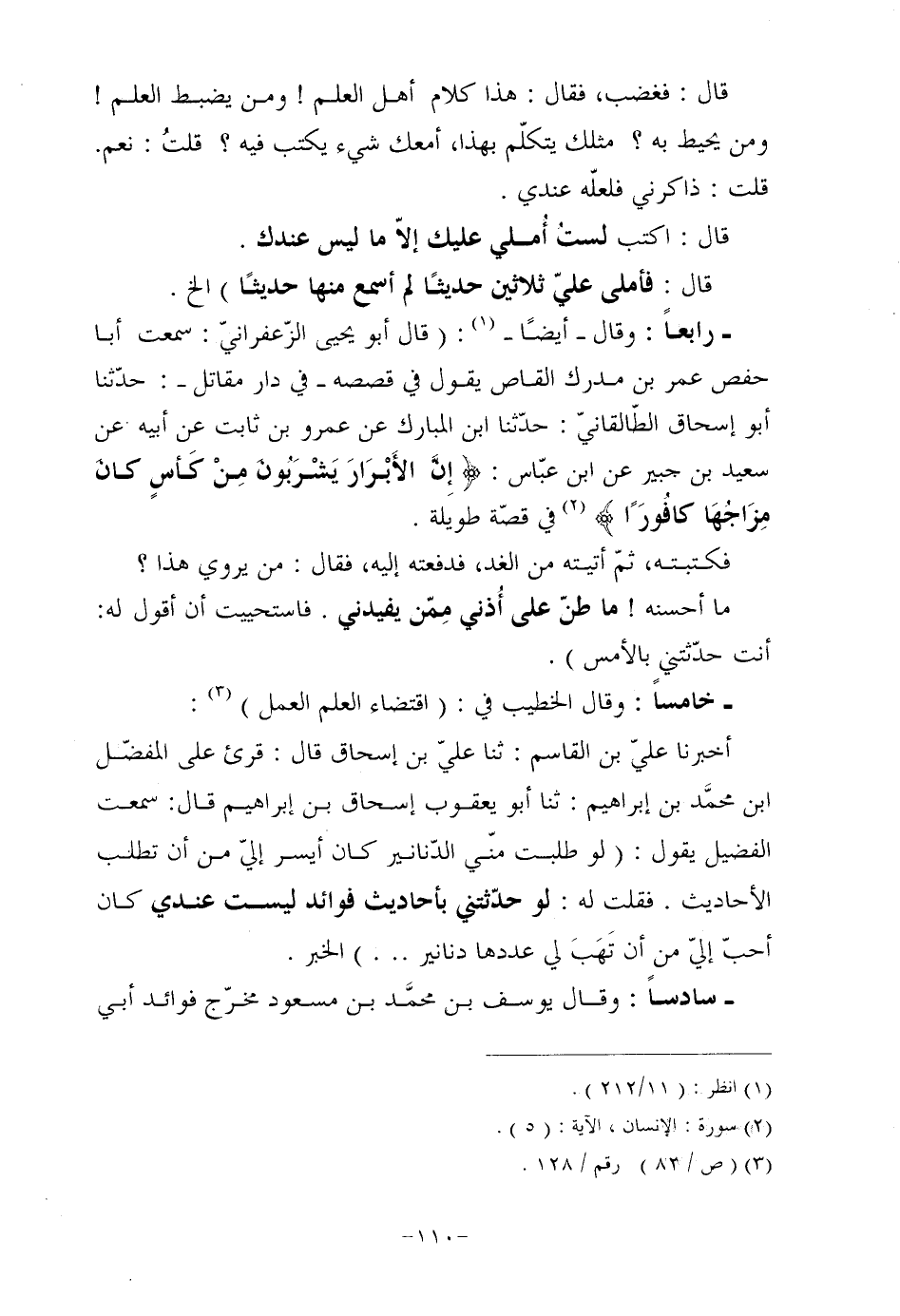 خامساً: وقال الخطيب في: (اقتضاء العلم العمل) (¬3) : "أخبرنا عليّ بن القاسم: ثنا عليّ بن إسحاق قال: قرئ على المفضّل ابن محمَّد بن إبراهيم: ثنا أبو يعقوب إسحاق بن إبراهيم قال: سمعت الفضيل يقول: "لو طلبت منّي الدّنانير كان أيسر إليّ من أن تطلب الأحاديث. فقلت له: لو حدّثتني بأحاديث فوائد ليست عندي كان أحبّ إليّ من أن تَهَبَ لي عددها دنانير ... " الخبر.