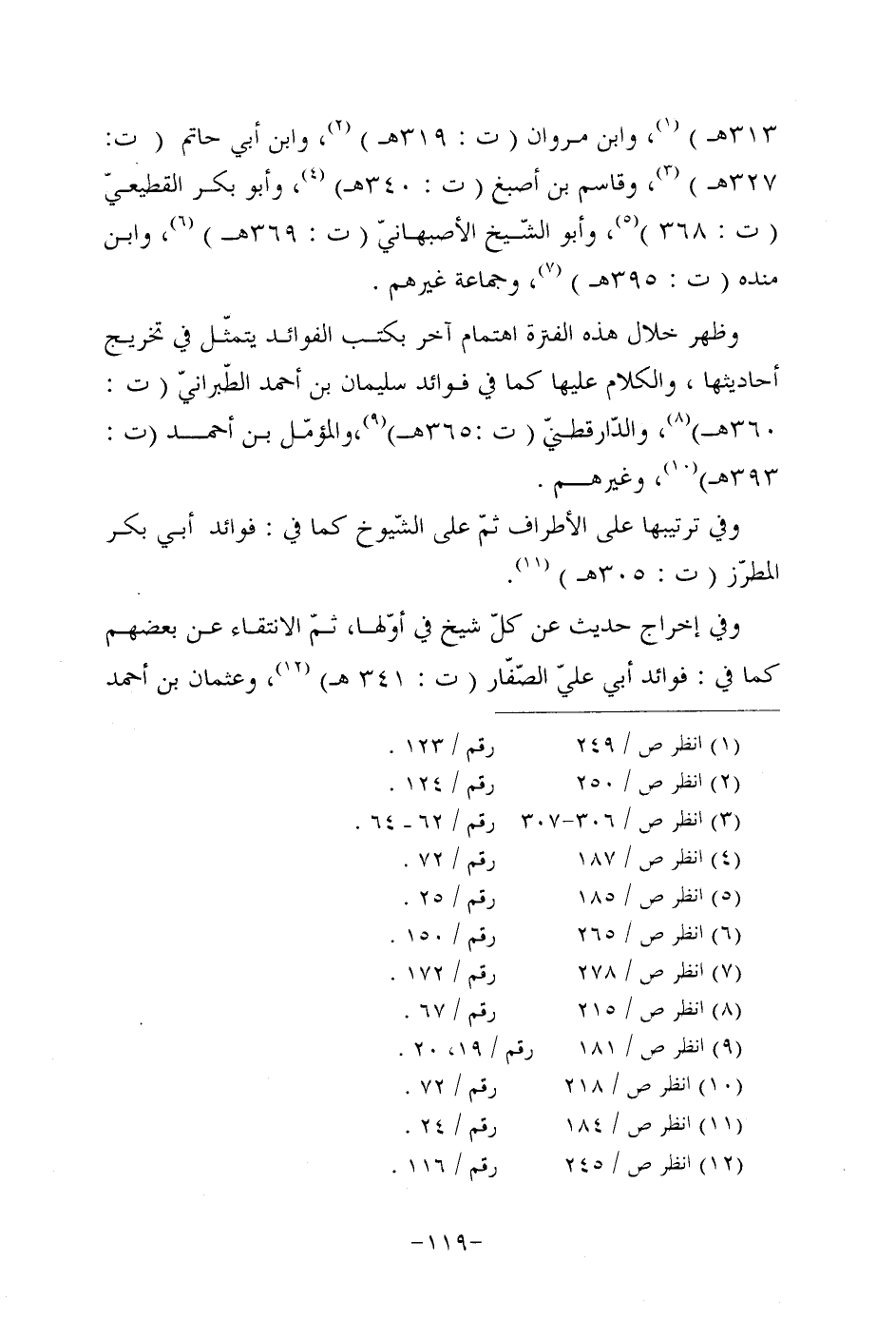 وظهر خلال هذه الفترة اهتمام آخر بكتب الفوائد يتمثّل في تخريج أحاديثها، والكلام عليها كما في فوائد سليمان بن أحمد الطّبرانيّ (ت: 360هـ) (¬8) ، والدّارقطنيّ (ت:365هـ) (¬9) ، والمؤمّل بن أحمد (ت: 393هـ) (¬10) ، وغيرهم.