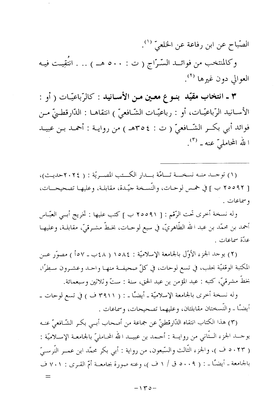 (¬3) هذا الكتاب انتقاه الدّارقطنيّ عن جماعة من أصحاب أبي بكر الشّافعيّ عنه يوجد الجزء الثّاني من رواية: أحمد بن عبيد الله المحامليّ بالجامعة الإسلاميّة: (5023 ف) ، والجزء الثّالث والسّبعون، من رواية: أبي بكر محمَّد ابن عمر النّرسيّ بالجامعة أيضا: (5009 ق/1 ف) ، وعنه صورة بجامعة أمّ القرى: 701 ف (240- 262) في اثنتين وعشرين لوحة. والجزء الأوّل من الجزء الرّابع والثمانين بمكتبة الأسد: 1150 (92- 110) وعنه صورة بالجامعة الإسلاميّة أيضا: 5054 ف (92ب- 110أ) في ثمان عشرة لوحة، بخطّ مشرقيّ، وجميع النّسخ مقابلة، وعليها تصحيحات وسماعات.
