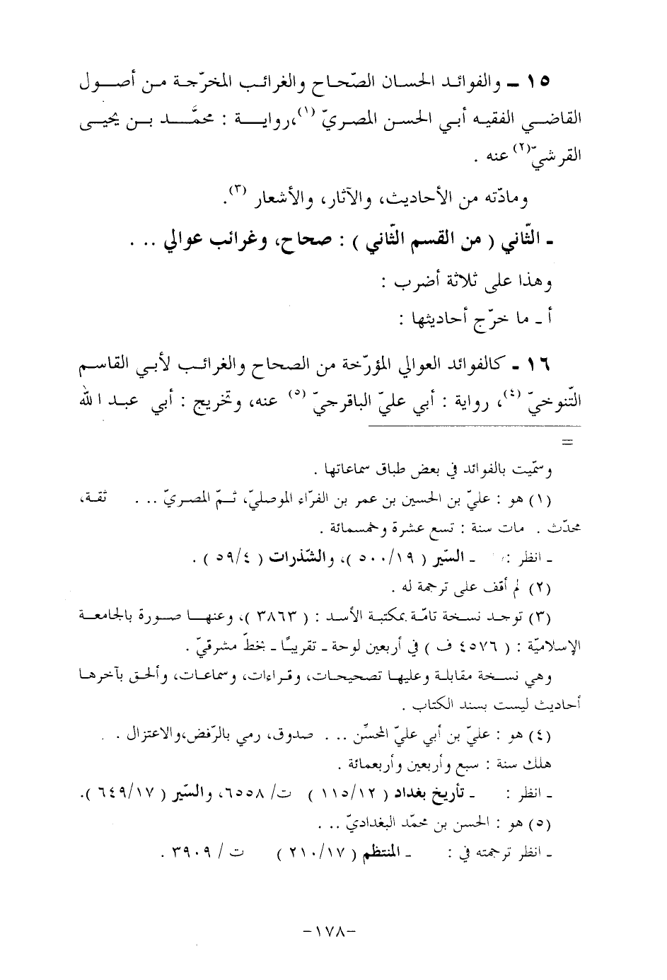 15- والفوائد الحسان الصّحاح والغرائب المخرّجة من أصول القاضي الفقيه أبي الحسن المصريّ (¬1) ،رواية: محمَّد بن يحيى القرشيّ (¬2) عنه.