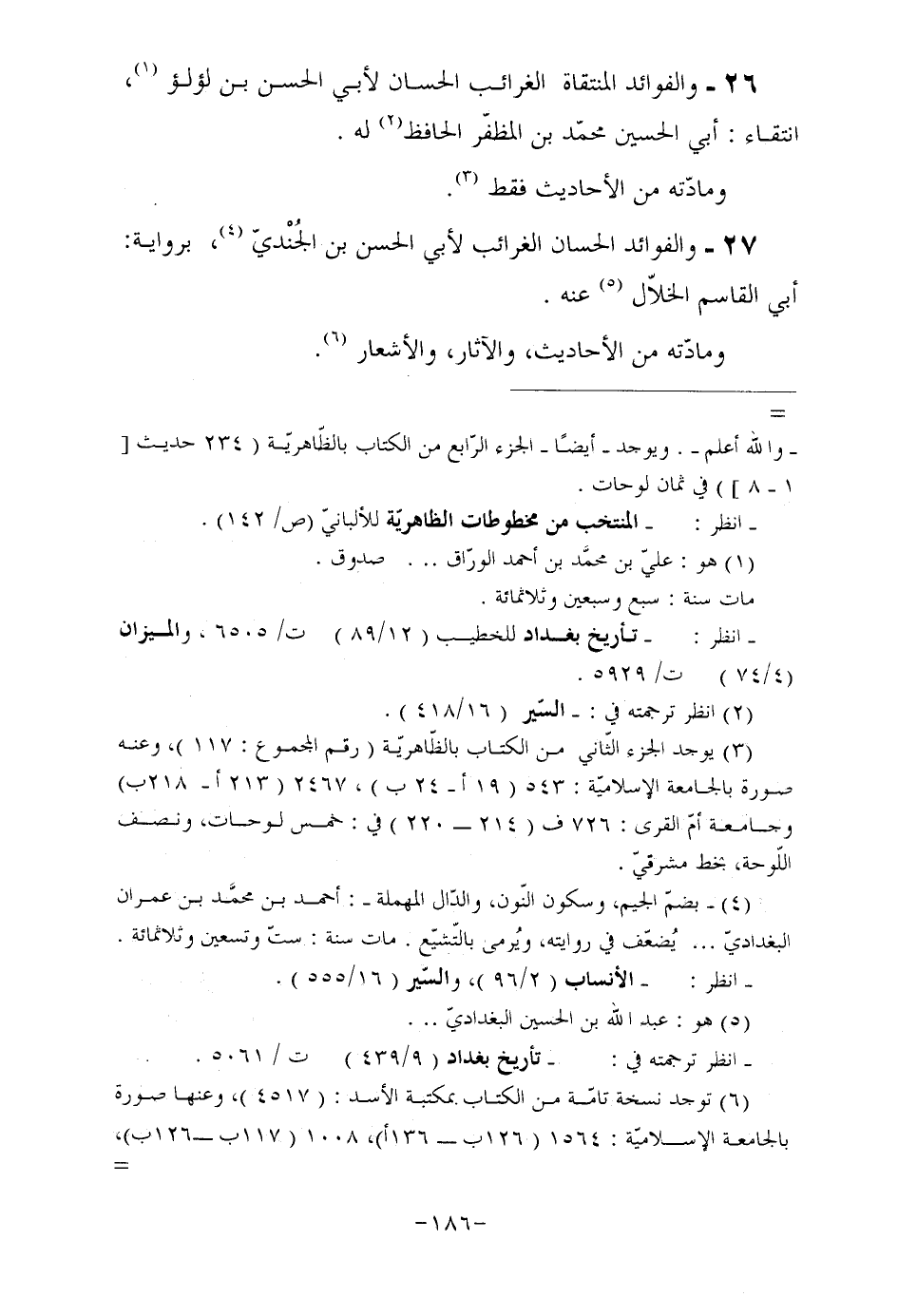 26- والفوائد المنتقاة الغرائب الحسان لأبي الحسن بن لؤلؤ (¬1) ، انتقاء: أبي الحسين محمّد بن المظفّر الحافظ (¬2) له.