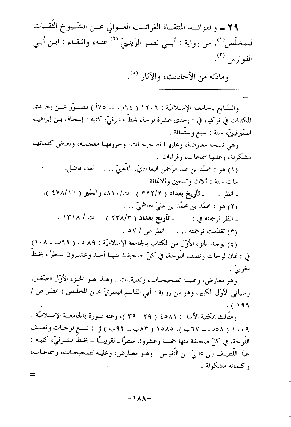 29- والفوائد المنتقاة الغرائب العوالي عن الشّيوخ الثّقات للمخلّص (¬1) ، من رواية: أبي نصر الزّينبيّ (¬2) عنه، وانتقاء: ابن أبي الفوارس (¬3) .