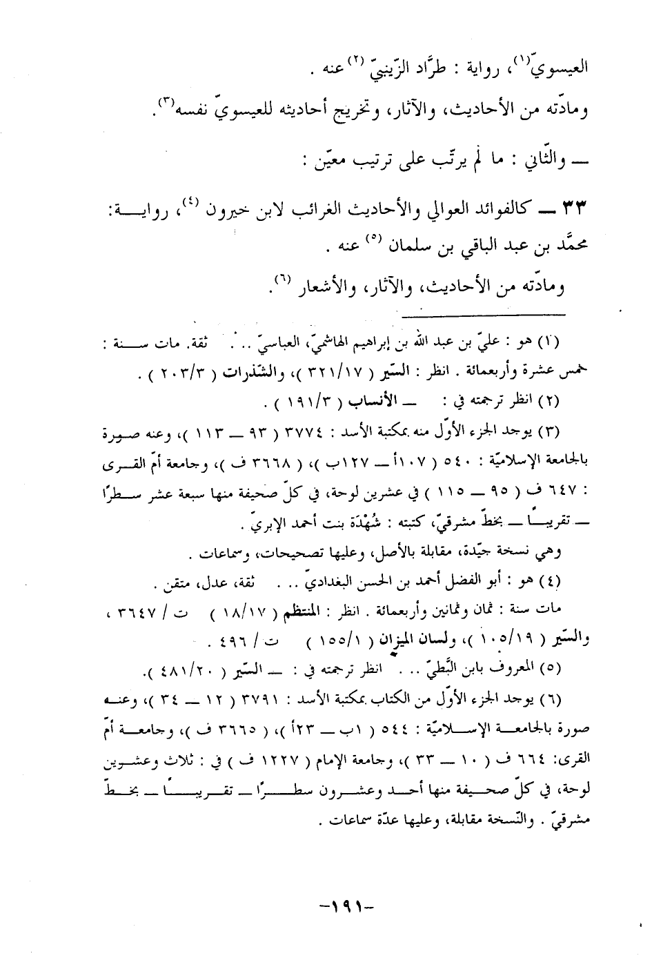33- كالفوائد العوالي والأحاديث الغرائب لابن خيرون (¬4) ، رواية: محمَّد بن عبد الباقي بن سلمان (¬5) عنه. ومادّته من الأحاديث، والآثار، والأشعار (¬6) .