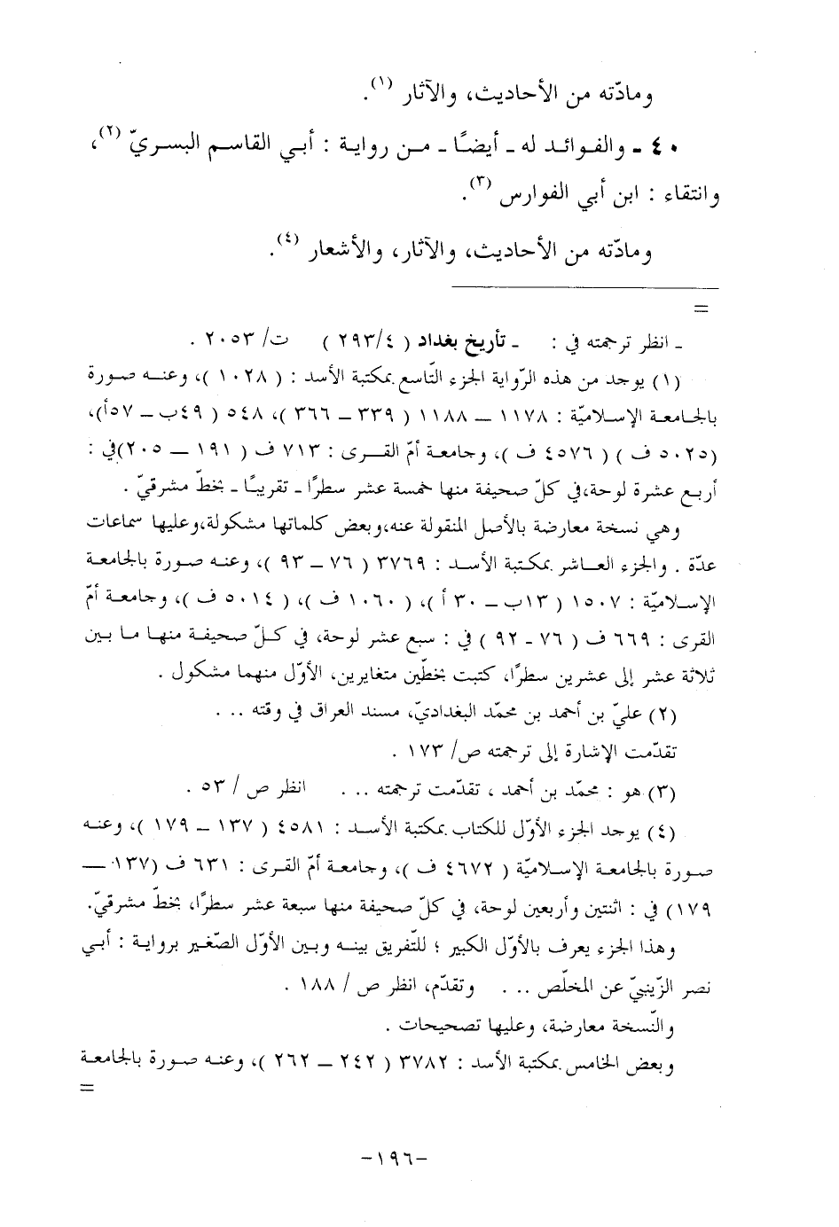 (¬4) يوجد الجزء الأوّل للكتاب بمكتبة الأسد: 4581 (137- 179) ، وعنه صورة بالجامعة الإسلاميّة (4672 ف) ، وجامعة أمّ القرى: 631 ف (137- 179) في: اثنتين وأربعين لوحة، في كلّ صحيفة منها سبعة عشر سطرًا، بخطّ مشرقيّ.