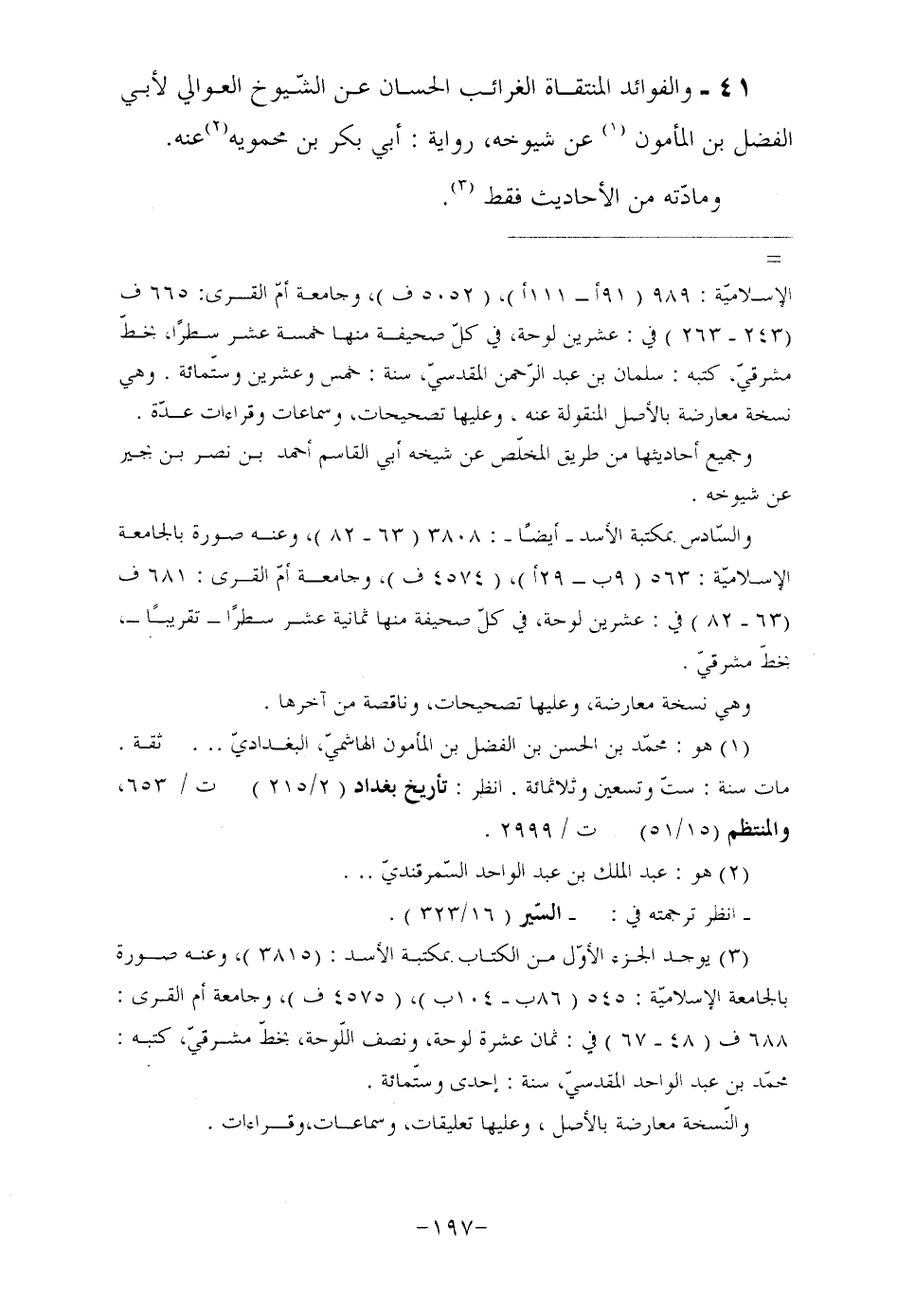 (¬3) يوجد الجزء الأوّل من الكتاب بمكتبة الأسد: (3815) ، وعنه صورة بالجامعة الإسلاميّة: 545 (86ب- 104ب) ، (4575 ف) ، وجامعة أم القرى: 688 ف (48- 67) في: ثمان عشرة لوحة، ونصف اللّوحة، بخطّ مشرقيّ، كتبه: محمَّد بن عبد الواحد المقدسيّ، سنة: إحدى وستّمائة.