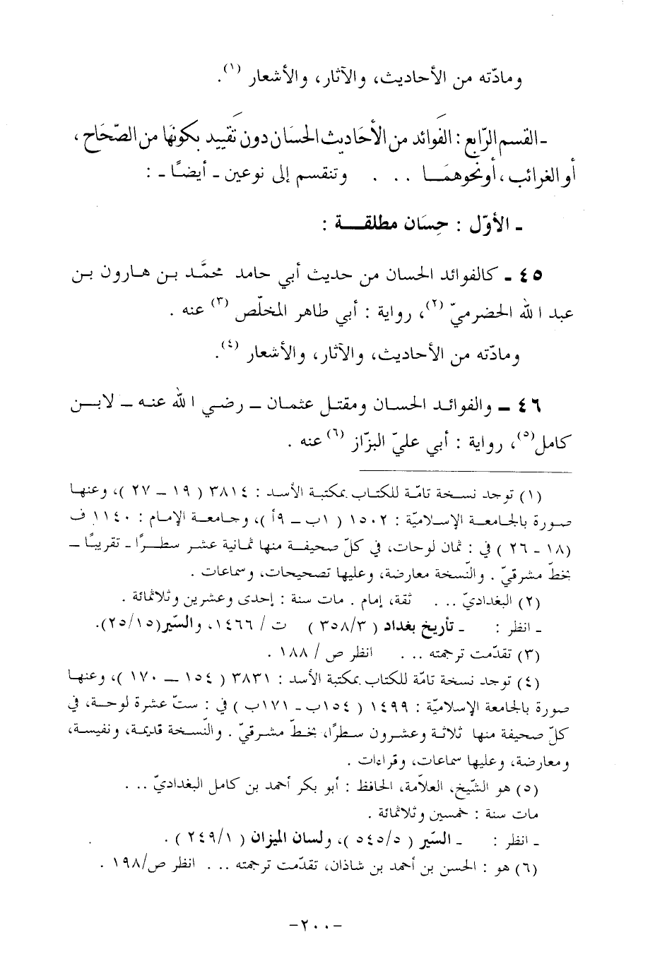 45- كالفوائد الحسان من حديث أبي حامد محمَّد بن هارون بن عبد الله الحضرميّ (¬2) ، رواية: أبي طاهر المخلّص (¬3) عنه. ومادّته من الأحاديث، والآثار، والأشعار (¬4) .