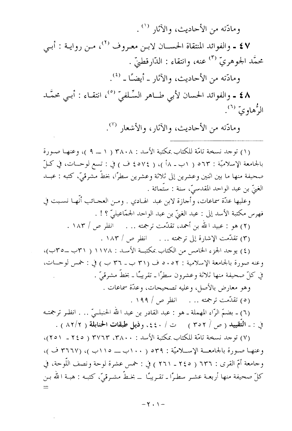 48- والفوائد الحسان لأبي طاهر السِّلفيّ (¬5) ، انتقاء: أبي محمَّد الرُّهاويّ (¬6) . ومادّته من الأحاديث، والآثار، والأشعار (¬7) .