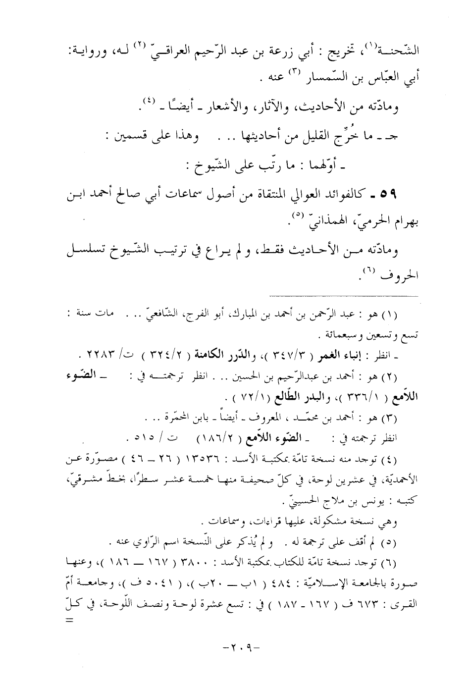 (¬6) توجد نسخة تامّة للكتاب بمكتبة الأسد: 3800 (167- 186) ، وعنها صورة بالجامعة الإسلاميّة: 484 (1ب- 20ب) ، (5041 ف) ، وجامعة أمّ القرى: 673 ف (167- 187) في: تسع عشرة لوحة ونصف اللّوحة، في كلّ صحيفة منها ما بين ستّة عشر إلى ثلاثة وعشرين سطرًا، بخطّ مشرقيّ، كتبه: أبو الفرج عبد الخالق بن أبي شجاع السّرّاج، سنة: سبع وثلاثين وخمسمائة.