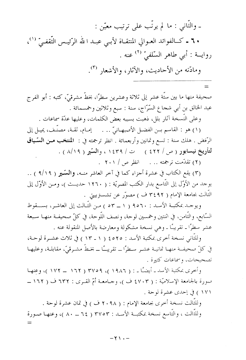 60- كالفوائد العوالي المنتقاة لأبي عبد الله الرّئيس الثّقفيّ (¬1) ، رواية: أبي طاهر السّلفيّ (¬2) عنه. ومادّته من الأحاديث، والآثار، والأشعار (¬3) .