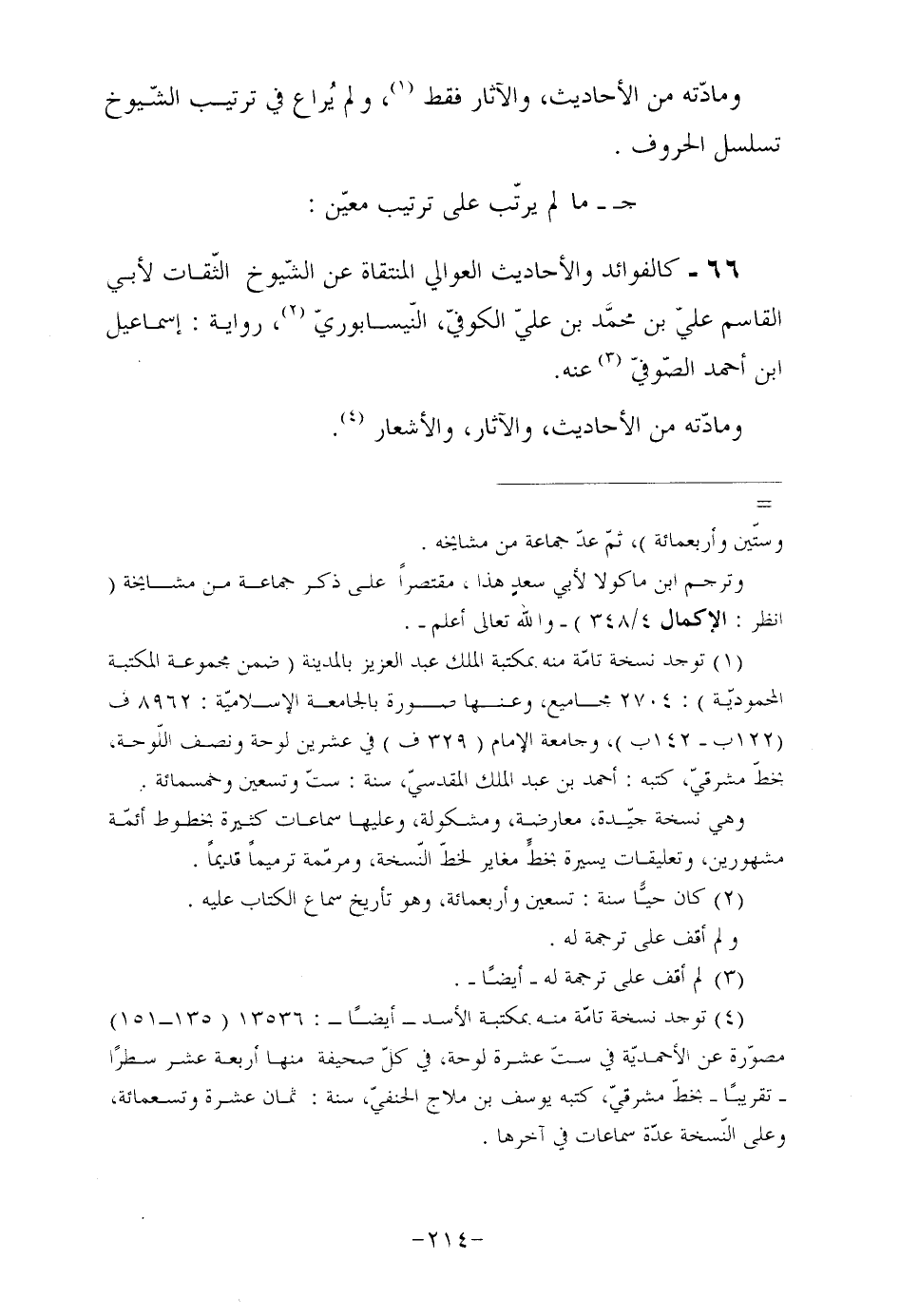 66- كالفوائد والأحاديث العوالي المنتقاة عن الشّيوخ الثّقات لأبي القاسم عليّ بن محمَّد بن عليّ الكوفيّ، النّيسابوريّ (¬2) ، رواية: إسماعيل ابن أحمد الصّوفيّ (¬3) عنه. ومادّته من الأحاديث، والآثار، والأشعار (¬4) .