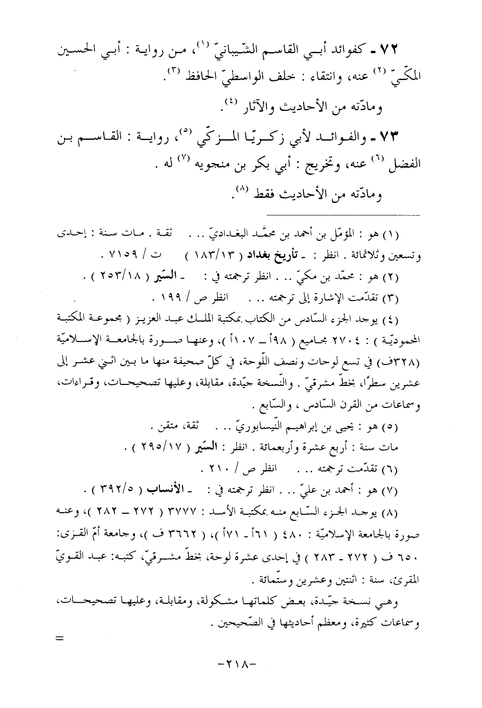 73- والفوائد لأبي زكريّا المزكّي (¬5) ، رواية: القاسم بن الفضل (¬6) عنه، وتخريج: أبي بكر بن منجويه (¬7) له. ومادّته من الأحاديث فقط (¬8) .
