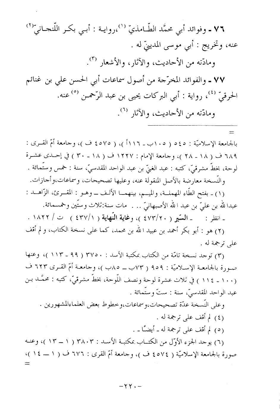 77- والفوائد المخرّجة من أصول سماعات أبي الحسن علي بن غنائم الحرقيّ (¬4) ، رواية: أبي البركات يحيى بن عبد الرّحمن (¬5) عنه. ومادّته من الأحاديث، والآثار (¬6) .