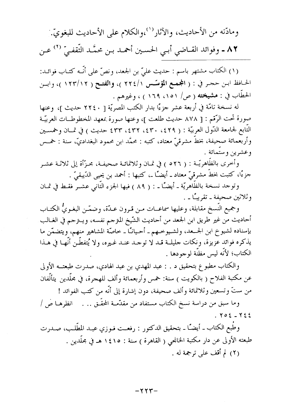 وجميع النّسخ مقابلة، وعليها سماعات من قرون عدّة، وضمّن البغويُّ الكتاب أحاديث من غير طريق ابن الجعد من أحاديث الشّيخ المترجم نفسه، ويترجم في الغالب بإسناده لشيوخ ابن الجعد، ولشيوخهم أحيانا خاصّة المشاهير منهم، ويتضمّن ما يذكره فوائد عزيزة، ونكات جليلة قد لا توجد عند غيره، ولا يُتفطّن أنّها في هذا الكتاب؛ لأنّه ليس مظنّة لوجودها.