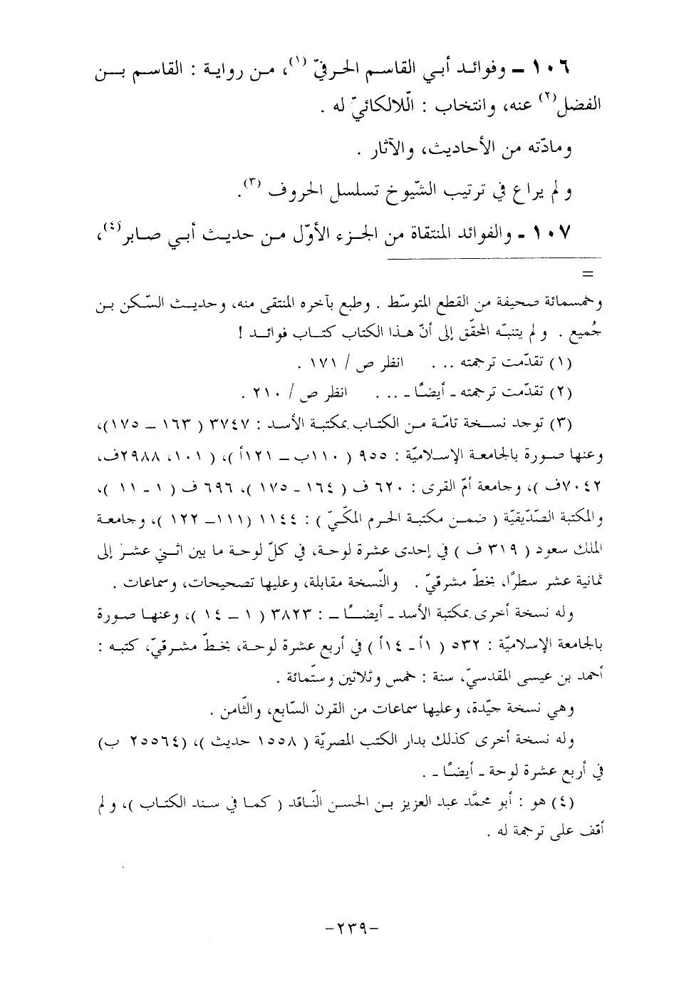 106- وفوائد أبي القاسم الحرفيّ (¬1) ، من رواية: القاسم بن الفضل (¬2) عنه، وانتخاب: الّلالكائيّ له. ومادّته من الأحاديث، والآثار. ولم يراع في ترتيب الشّيوخ تسلسل الحروف (¬3) .