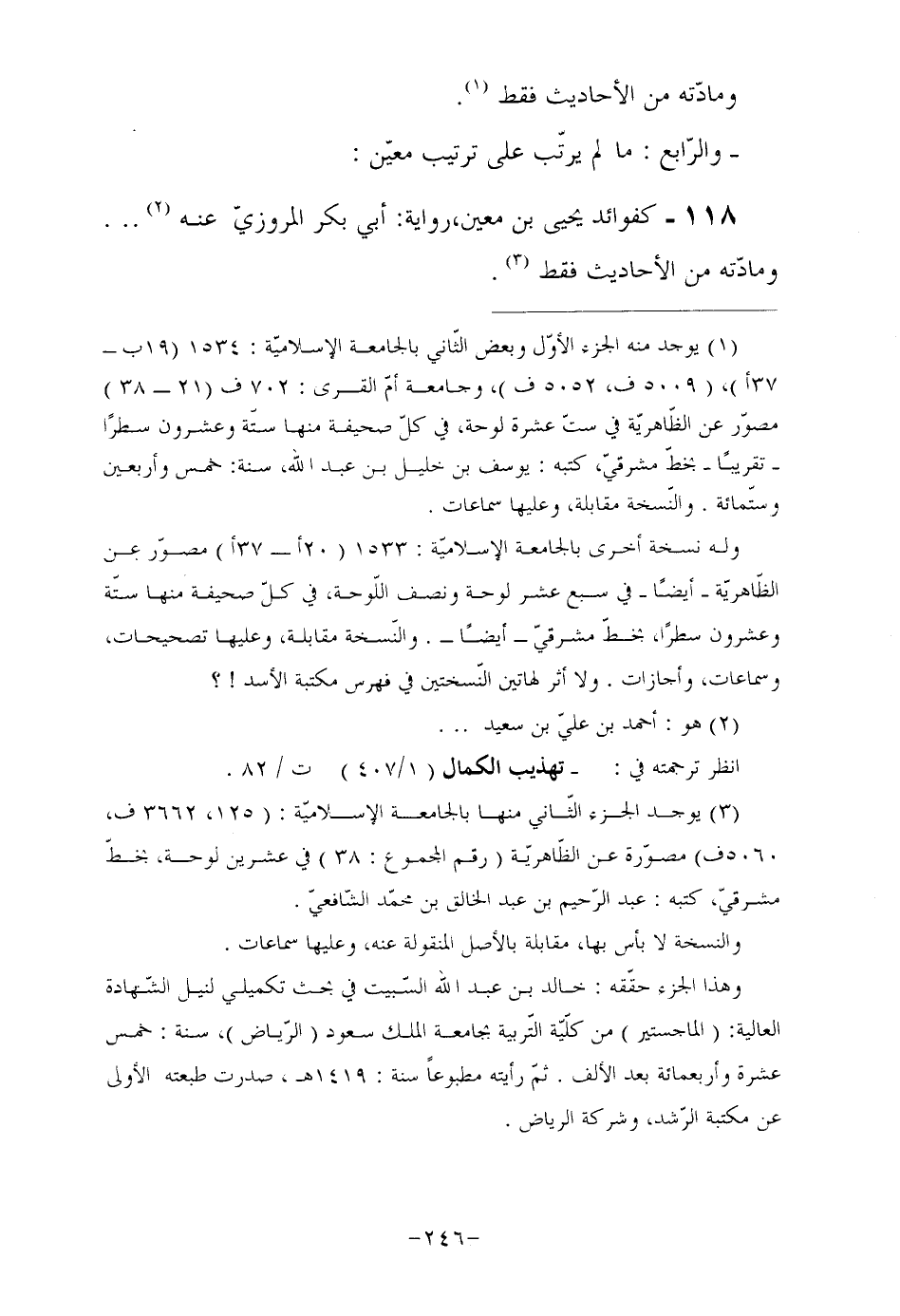 118- كفوائد يحيى بن معين، رواية: أبي بكر المروزيّ عنه (¬2) ... ومادّته من الأحاديث فقط (¬3) .