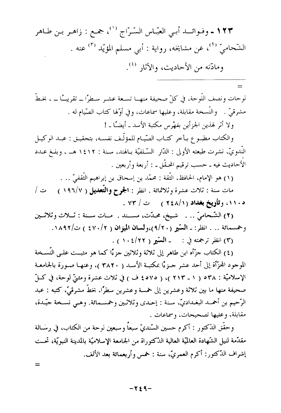 123- وفوائد أبي العبّاس السّرّاج (¬1) ، جمع: زاهر بن طاهر الشّحاميّ (¬2) ، عن مشايخه، رواية: أبي مسلم المؤيّد (¬3) عنه. ومادّته من الأحاديث، والآثار (¬4) .