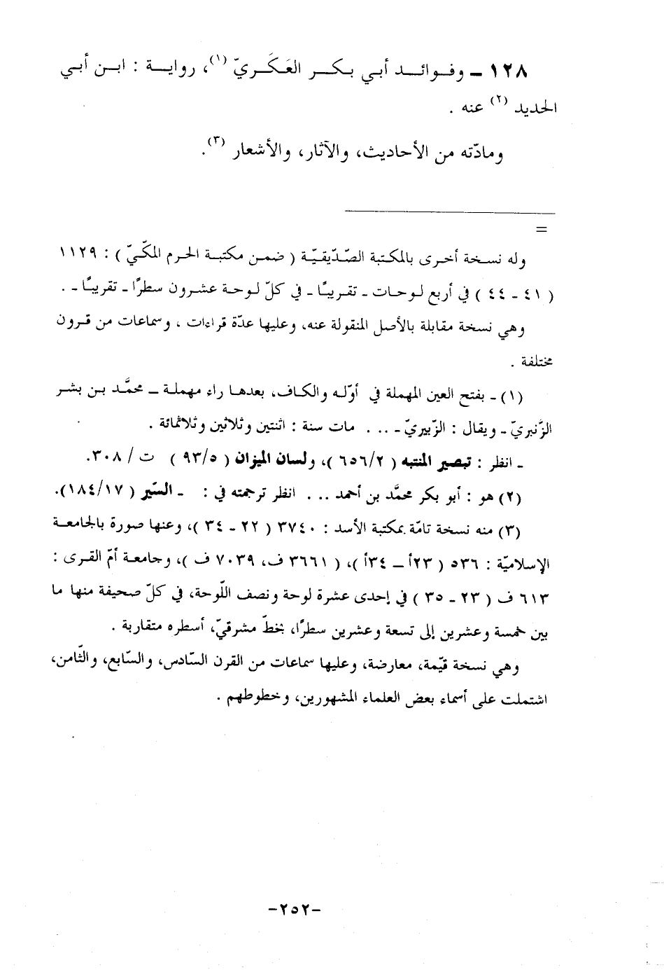 128- وفوائد أبي بكر العَكَريّ (¬1) ، رواية: ابن أبي الحديد (¬2) عنه. ومادّته من الأحاديث، والآثار، والأشعار (¬3) .