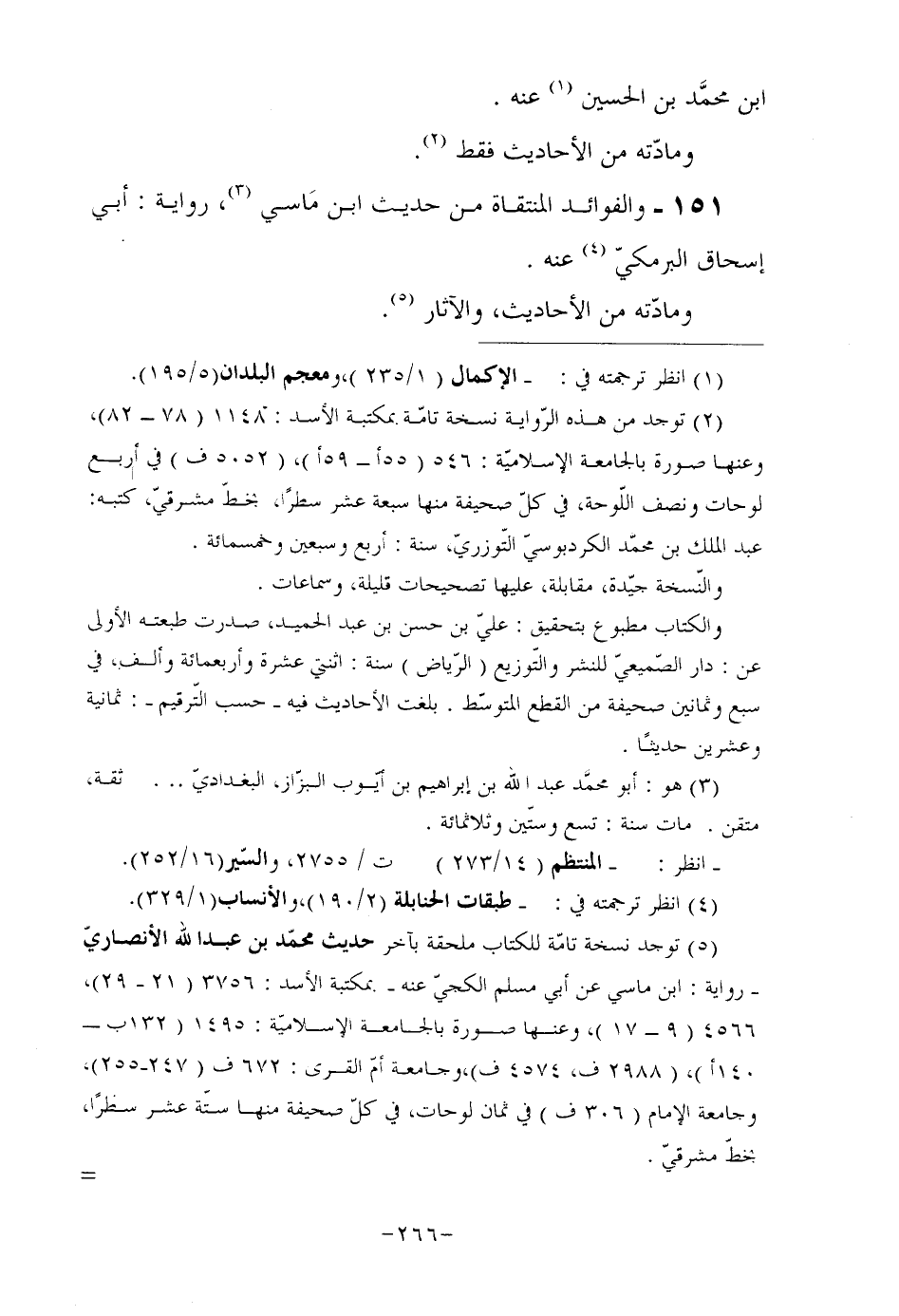 151- والفوائد المنتقاة من حديث ابن مَاسي (¬3) ، رواية: أبي إسحاق البرمكيّ (¬4) عنه. ومادّته من الأحاديث، والآثار (¬5) .