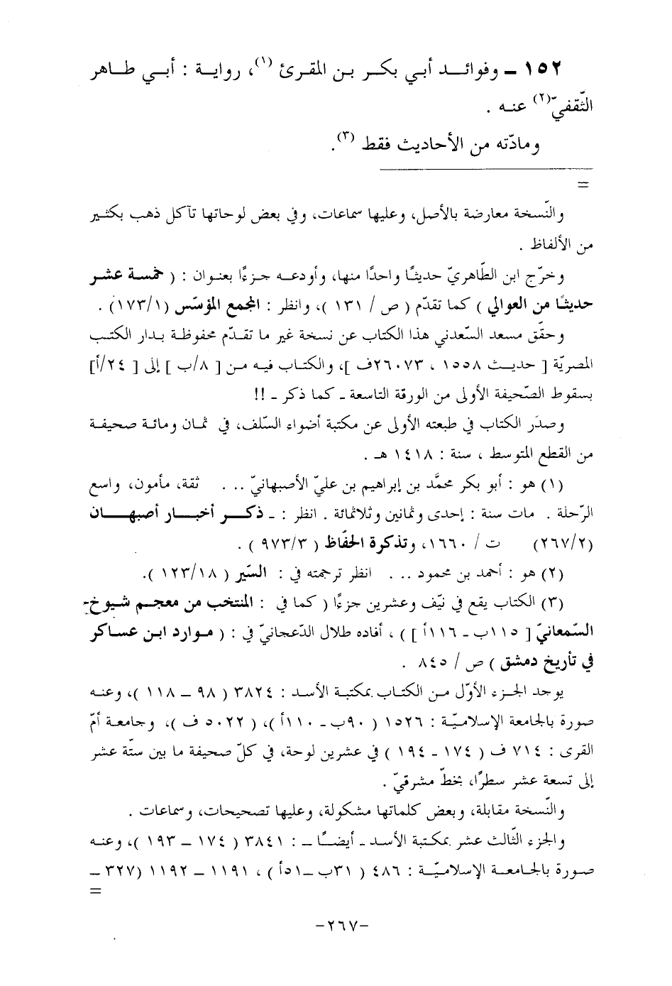 152- وفوائد أبي بكر بن المقرئ (¬1) ، رواية: أبي طاهر الثّقفيّ (¬2) عنه. ومادّته من الأحاديث فقط (¬3) .